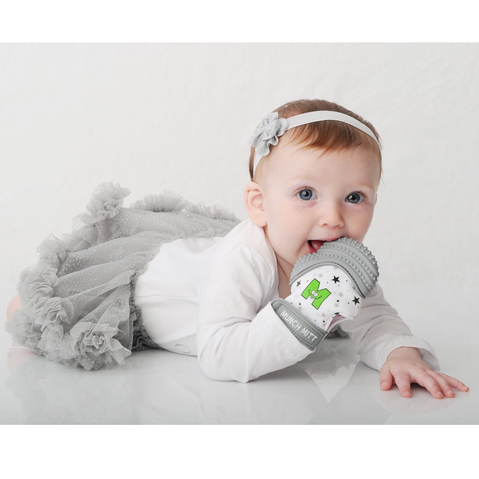 Un produit miracle, indispensable et ludique ! Bébé ne pourra plus se passer de sa moufle mitaine de dentition, qui soulage et apaise les gencives pendant ses poussées dentaires de la marque Malarkey Kids.