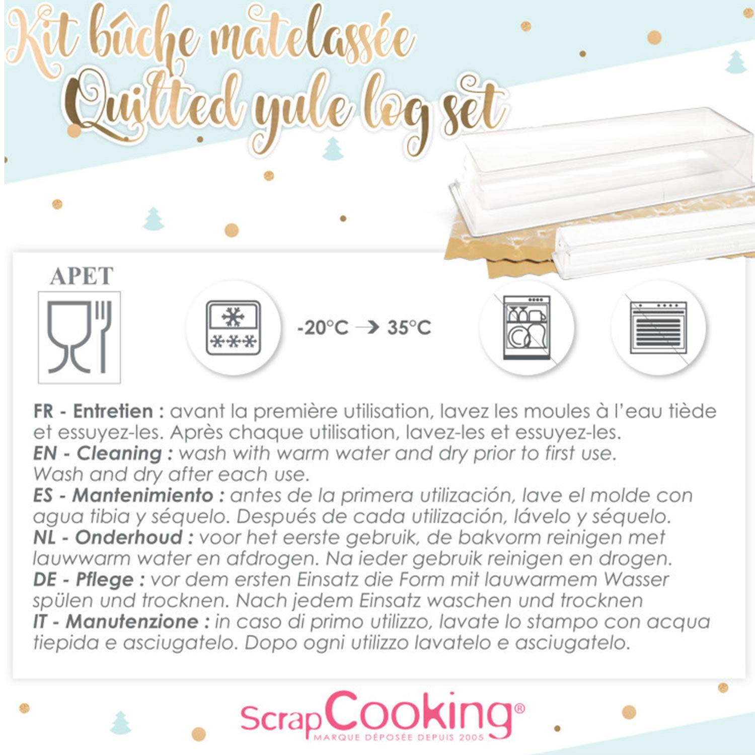 Pour réaliser une bûche professionnelle à l'effet matelassée en relief, ce coffret ScrapCooking est idéal pour réussir toutes vos bûches pour les fêtes de fin d'année. Composé d'un moule bûche semi-rigide réutilisable, 1 insert bûche semi-rigide, 1 feuille structure matelassée pour créer votre effet et 2 supports dorés pour présenter votre bûche à table. Vous pourrez ainsi facilement réaliser vos bûches de Noël glacées! Ces moules peuvent être utilisées de -20°C à 35°C mais ne vont pas au lave vaisselle, ni au four. Dimensions du moule : 33 cm x 11,5 cm x 6 cm. Dimensions de l'insert: 31 cm x 6 cm x 3 cm