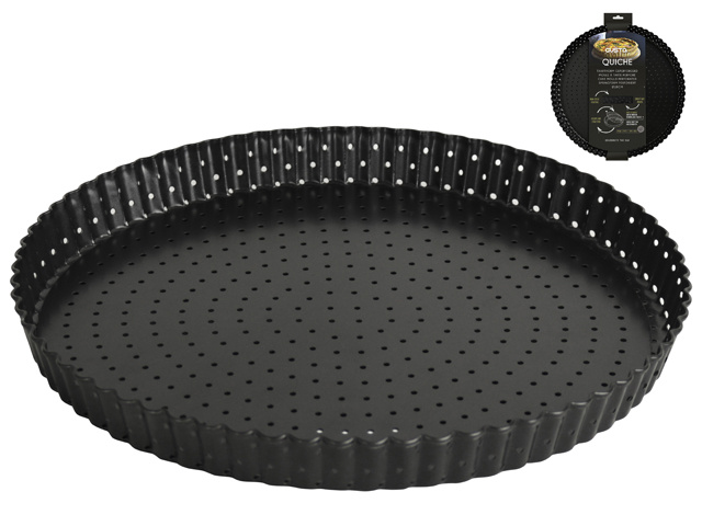 Moule à tarte GUSTA 28 cm avec fond amovible en acier anti-adhérent perforé pour une pâte plus croustillante. Idéal pour démouler les tartes avec facilité.