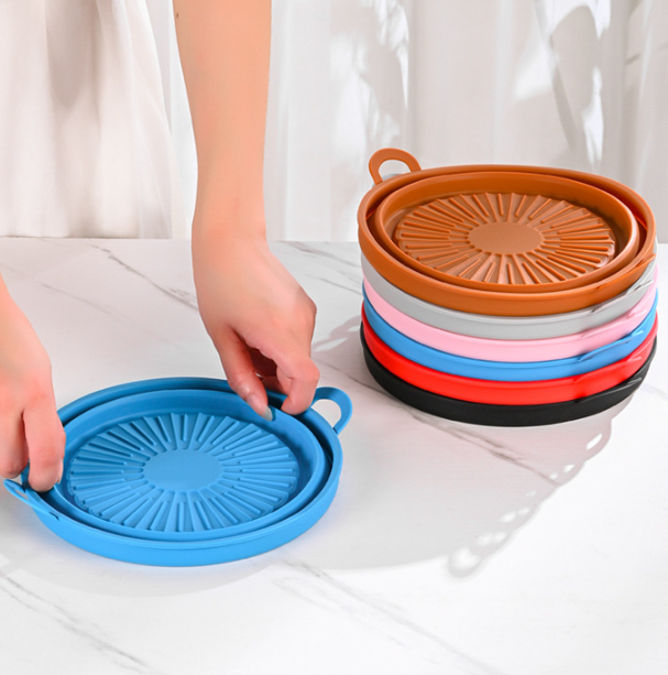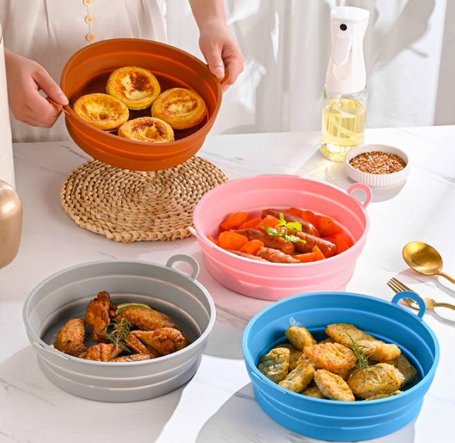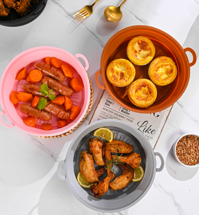Ce moule rond en silicone alimentaire s'intègre parfaitement dans la friteuse et évite les résidus alimentaires collants et brûlés dans la friteuse à air. Le récipient est réutilisable et peut être lavé au lave-vaisselle. Le bord surélevé maintient les aliments en place et retient les miettes et l'excès de graisse. La forme peut être compressée afin de prendre moins de place lorsqu'elle n'est pas utilisée.