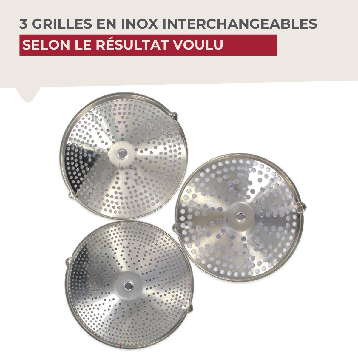 | Plus produit | LE PETIT + : Il dispose de 3 grilles de découpe interchangeables qui s'adaptent à tous types de légumes et de fruits ; sa manivelle est très facile à prendre en main |