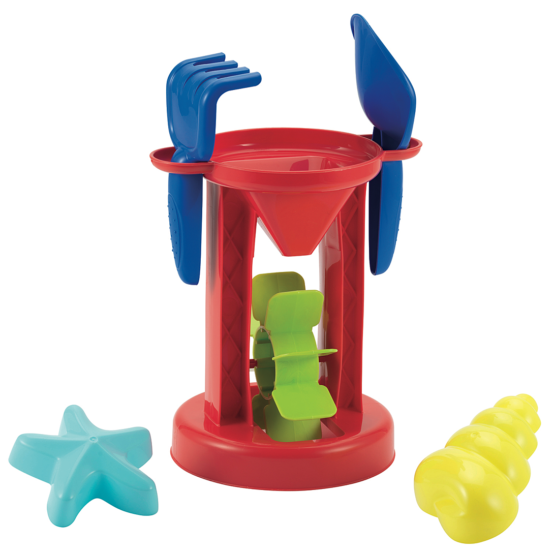Un moulin à sable et à eau garni d'une pelle , d'un râteau et de 2 moules à sable. Conseillé dès 18 mois. Origine France Garantie.