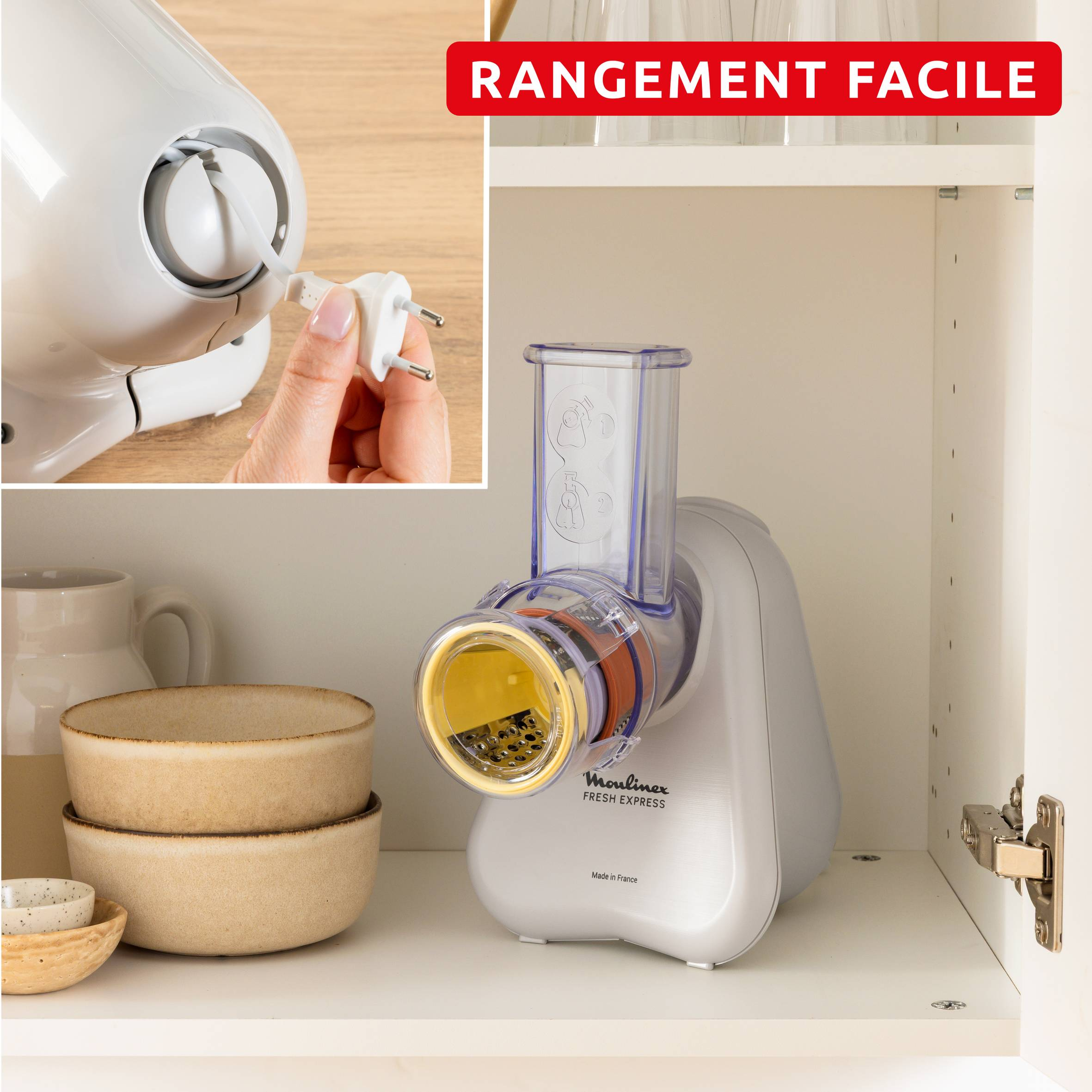 Le format très compact trouve sa place dans tous les placards et le système pratique permet de ranger les cônes et le cordon dans l'appareil.