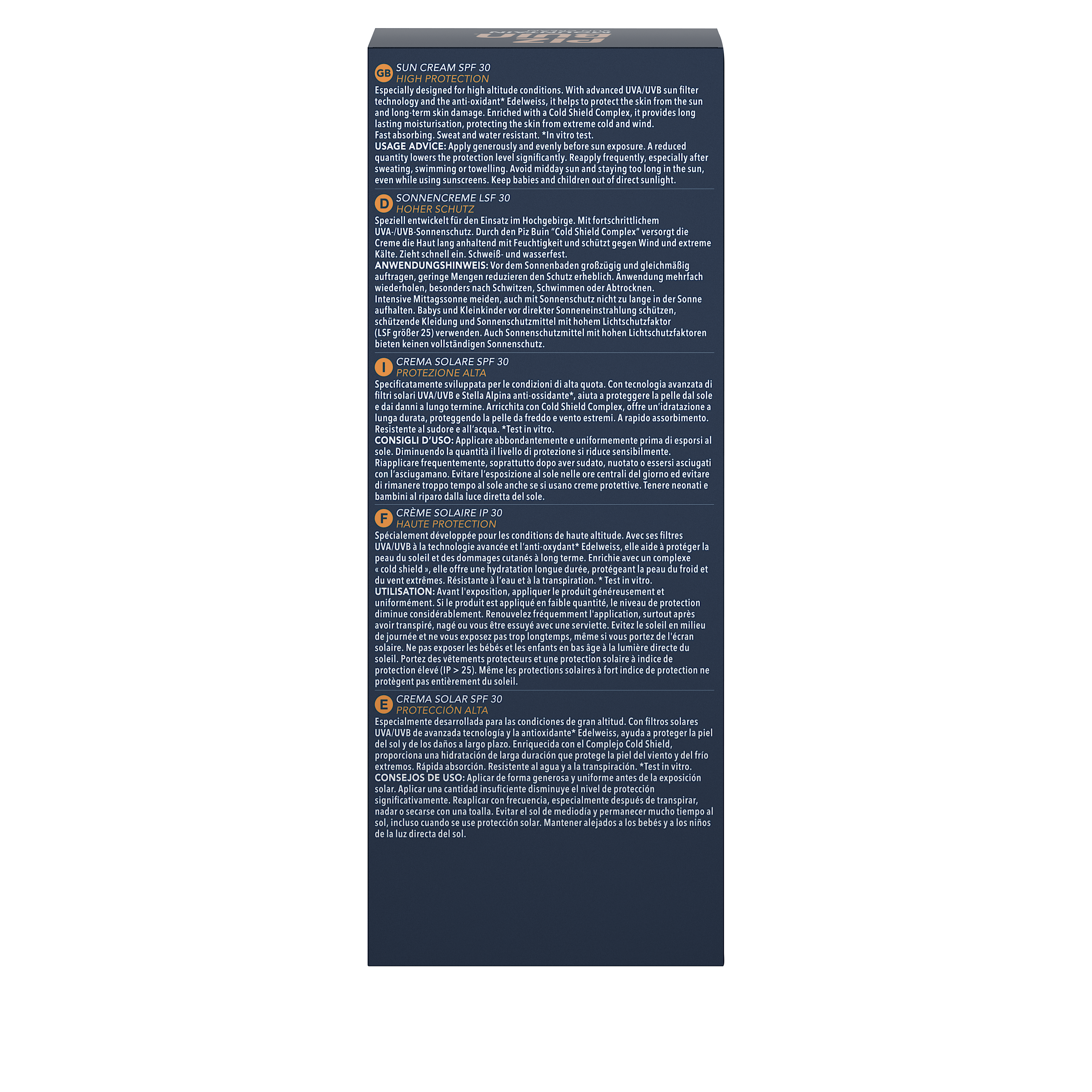 Crème solaire visage haute protection longue durée spécialement développé pour les conditions de haute altitude. Avec ses filtres UVA / UVB et l'anti-oxydant* Edelweiss, il aide à protéger la peau du soleil et des dommages cutanés à long terme. Enrichi avec un complexe "cold shield", il prévient contre le froid et le vent extrême en haute altitude. * Test in vitro Formule triple protection spécialement développée pour les conditions d'ensoleillement, de froid et de vent en haute altitude. Ses filtres UVA / UVB à la technologie avancée et l'extrait naturel d'Edelweiss anti-oxydant* protègent du soleil et des dommages cutanés à long terme. Elle agit comme un "bouclier anti-froid" et hydrate intensément la peau agressée par les conditions extrêmes des hautes altitudes. Sa formule résiste à l'eau et à la transpiration. * Test in vitro