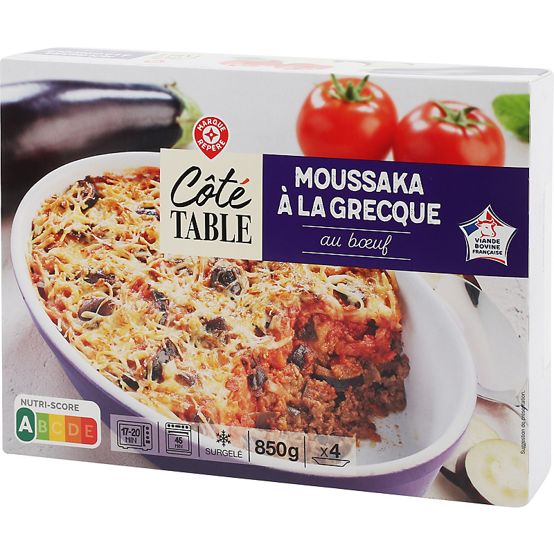 Gratin à base de viande de bœuf, d'aubergines et de tomates, surgelé. COTE TABLE