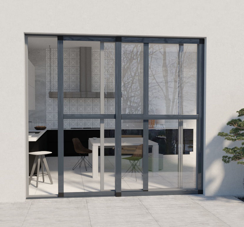 Cette réduction visuelle des profilés est complétée naturellement par l'étroitesse de chacun d'entre eux, même celui situé tout en bas. Aucune poignée n'est nécessaire à la manipulation des vantaux (intérieur / extérieur).