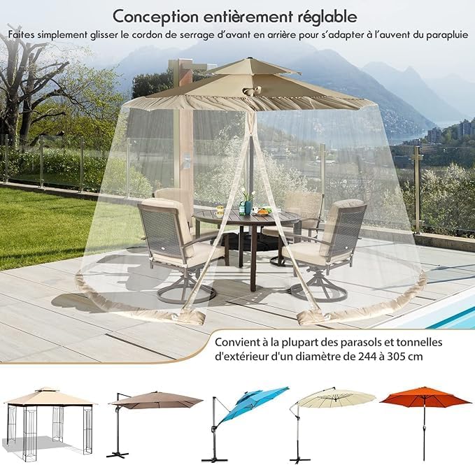 Cordon de serrage supérieur de la maille ajuste la taille pour s'adapter au parasol de 2,43 m à 3 m de diamètre