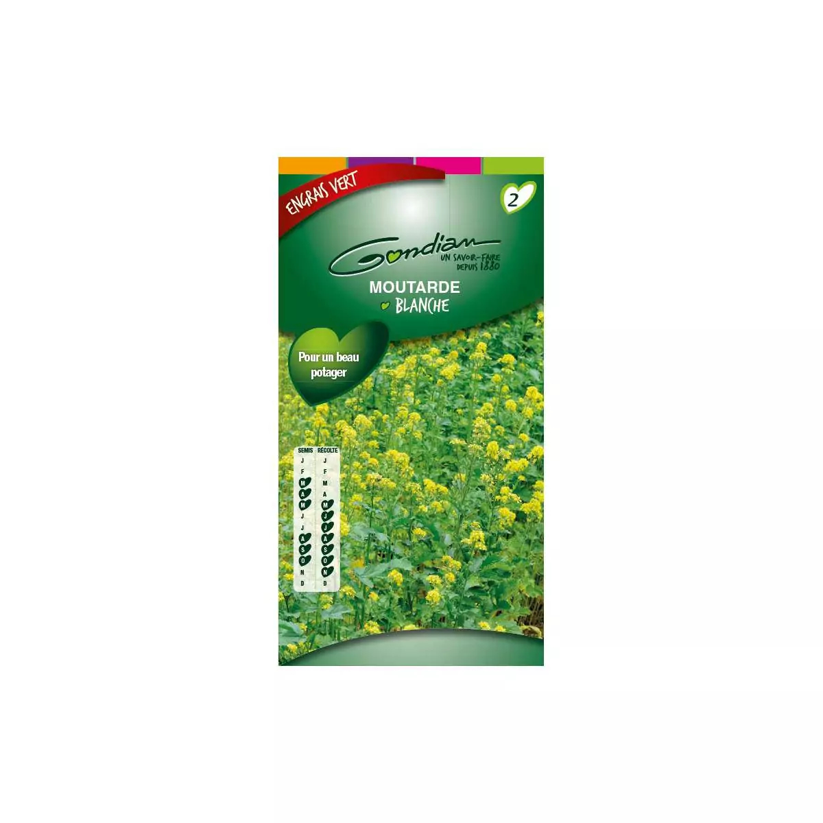 Les cultures successives d'un potager puisent dans les réserves du sol. Les engrais verts ont l'avantage de regénérer les sols, de limiter le développement des mauvaises herbes et d'attirer des insectes pollinisateurs auxilliaires des jardiniers.Les plantes utilisées comme engrais vert sont d'implantation facile, leur croissance est rapide avec une végétation abondante. Coupées, broyées et incorporées au sol, elles améliorent naturellement sa fertilité. C'est aussi une solution économique et écologique pour l'entretien des jardinsDescription:La moutarde est une plante aux fleurs jaunes qui s'implante facilement et pousse rapidement même sur les terrains pauvres. Elle limite ainsi le développement des mauvaises herbes.Ses racines nombreuses et profondes, ameublissent les terrains et captent les nitrates présents dans les solsUtilisations:Recommandée sur les cultures potagères tardives: haricots, tomates, courges... A eviter sur les cultures de radis ou de navetsConseils de culture:Préparez le sol superficiellement par griffageSemez à la volée environ 10 à 12g pour 10m²Ratissez pour enfouir légèrement les grainesEnviron 60 jour après le semis, coupez lorsque les plantes atteignent 25-30cm de hauteur. Broyez avec la tondeuse. Laissez sécher sur place pendant 8 jours. enfouissez la matière végétale dans le sol.4 à 5 semaines sont nécessaires à l'engrais vert pour se décomposer avant de semer une autre planteConditionnement : 100 grs pour 100m²