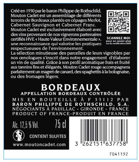 | Libellé | Mouton Cadet, 2021 - Bordeaux AOP - Rouge - 75 cl |
