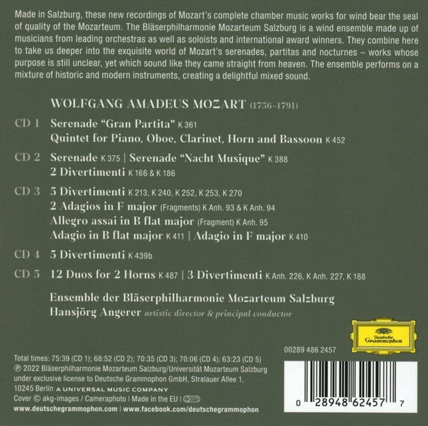 Deutsche Grammophon présente l'intégrale de la musique pour instruments à vent de Mozart, dans une magnifique édition Capbox 5CD. Ce nouvel enregistrement est marqué du sceau de qualité de la Fondation Mozarteum. L'ensemble est composé de diplômés ou de professeurs de l'université mondialement connue et réunit des musiciens de grands orchestres ainsi que des solistes et des lauréats de prix internationaux. Les cors, trompettes et timbales anciens, qui sont en partie utilisés, créent une délicieuse sonorité mixte en harmonie avec les instruments modernes.
