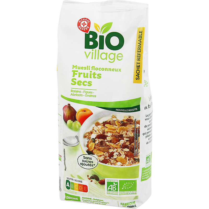 Muesli floconneux avec raisins secs, figues séchées, graines de tournesol, graines de lin et graines de courge - Produit issu de l'agriculture biologique BIO VILLAGE