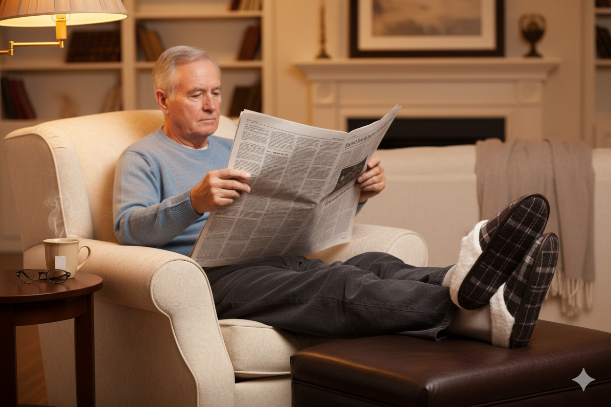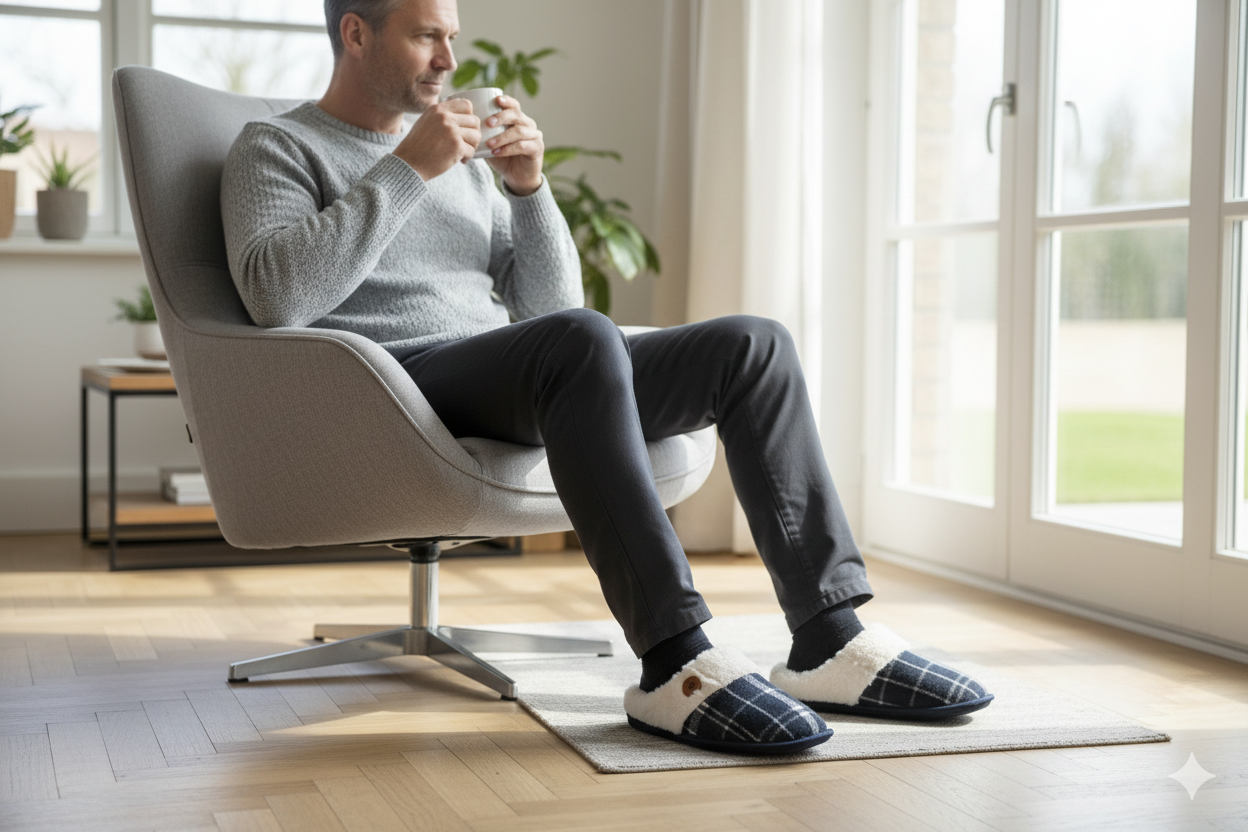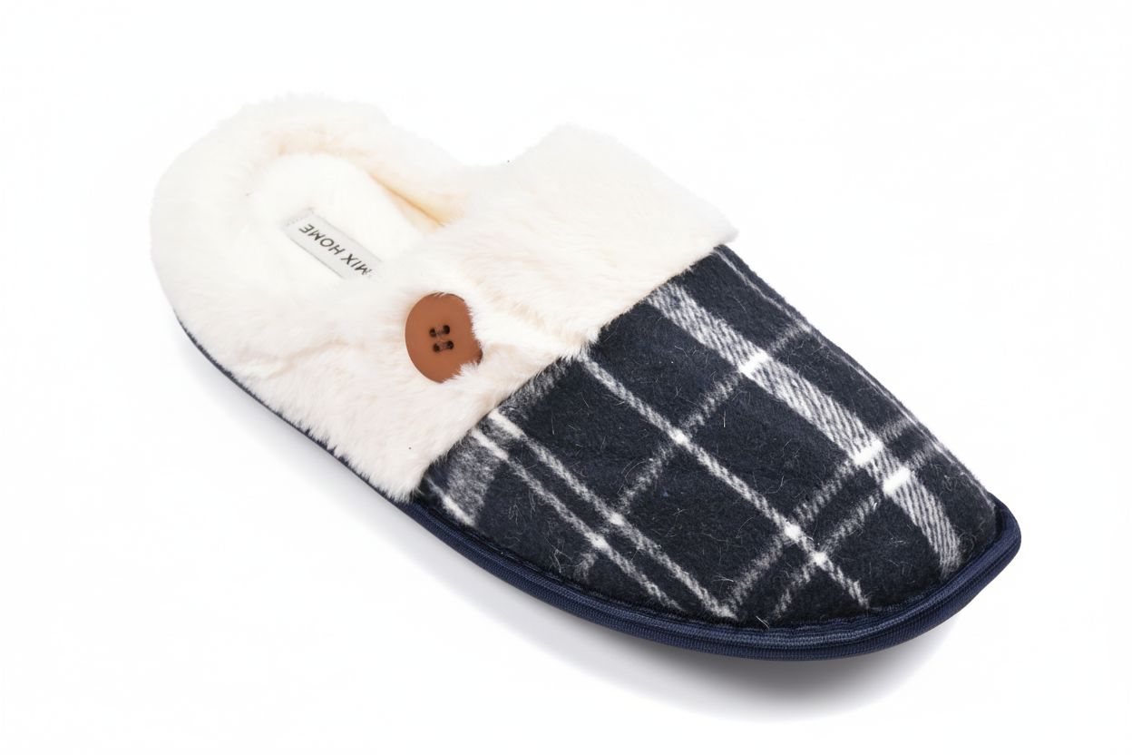 Le confort chaleureux du style classique. Ces mules homme à motif écossais allient légèreté, chaleur et sécurité, pour un bien-être quotidien tout au long de l’hiver. • Style traditionnel revisité Le dessus en tissu jacquard à carreaux écossais confère un charme intemporel. Un bouton cousu sur le revers en fourrure apporte une touche fantaisie élégante et discrète. • Douceur et chaleur intérieure L’intérieur entièrement fourré enveloppe le pied d’une chaleur bienfaisante. La doublure douce apporte une sensation de confort immédiat, parfaite pour les journées fraîches à la maison. • Semelle souple et sécurisante La semelle fine et légère en mousse flexible offre un excellent amorti tout en préservant la stabilité. Des patches antidérapants intégrés assurent une meilleure adhérence au sol, évitant les glissades. • Légèreté et praticité au quotidien Faciles à enfiler, ces mules se portent naturellement. Elles offrent la liberté de mouvement idéale pour les seniors souhaitant conjuguer confort et autonomie. • Élégance discrète et bien-être durable Disponibles en trois teintes classiques : – Marron : chaleureux et intemporel – Bleu marine : sobre et élégant – Noir : chic et indémodable Ces pantoufles sont le compagnon parfait des journées cocooning ou des soirées paisibles au coin du feu. Tailles disponibles : 41/42, 43/44, 45/46