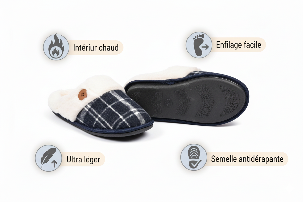 | Plus produit | Style classique revisité : Pantoufles homme écossaises ornées d’un bouton décoratif. Un design chaleureux et élégant pour un confort quotidien, inspiré des modèles traditionnels revisités avec raffinement.Intérieur doux et chaud : Fourrure synthétique intérieure ultra moelleuse offrant chaleur et douceur immédiate. Confort idéal pour affronter l’hiver à la maison.Semelle fine, souple et sûre : Semelle légère avec patches antidérapants assurant stabilité et sécurité. Confort amortissant, parfaite pour les sols intérieurs lisses.Légèreté et enfilage facile : Format mule à enfiler rapidement, sans effort. Parfait pour les seniors recherchant la simplicité d’utilisation et une marche agréable. |