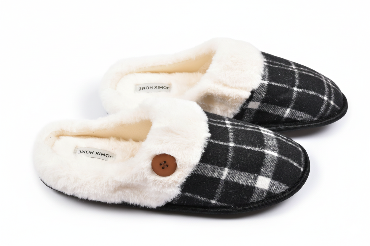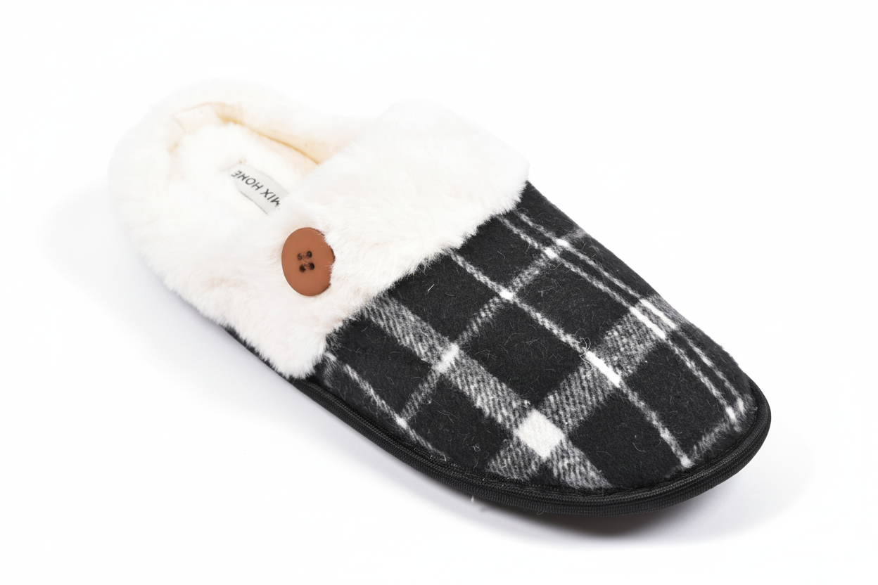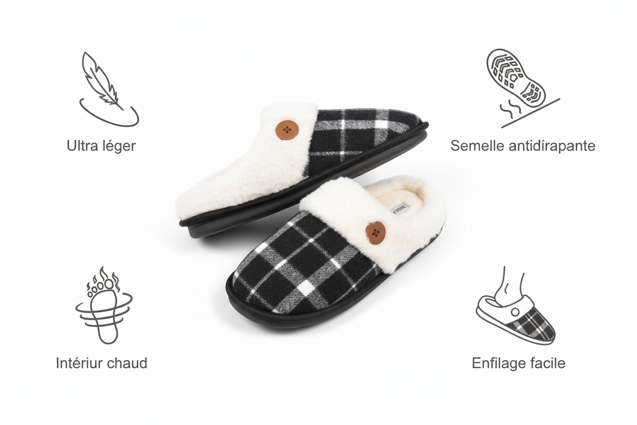 Plus produit Style classique revisité : Pantoufles homme écossaises ornées d’un bouton décoratif. Un design chaleureux et élégant pour un confort quotidien, inspiré des modèles traditionnels revisités avec raffinement.Intérieur doux et chaud : Fourrure synthétique intérieure ultra moelleuse offrant chaleur et douceur immédiate. Confort idéal pour affronter l’hiver à la maison.Semelle fine, souple et sûre : Semelle légère avec patches antidérapants assurant stabilité et sécurité. Confort amortissant, parfaite pour les sols intérieurs lisses.Légèreté et enfilage facile : Format mule à enfiler rapidement, sans effort. Parfait pour les seniors recherchant la simplicité d’utilisation et une marche agréable.