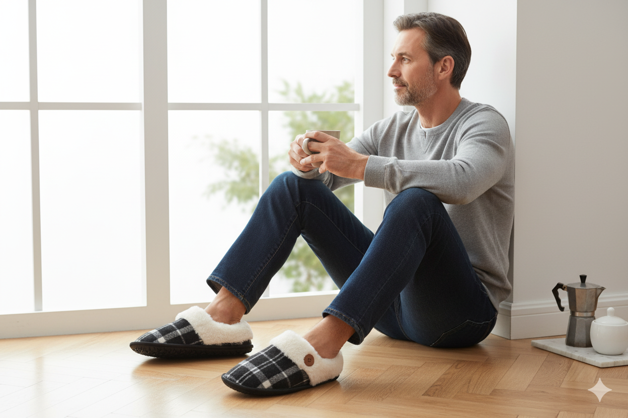 Le confort chaleureux du style classique. Ces mules homme à motif écossais allient légèreté, chaleur et sécurité, pour un bien-être quotidien tout au long de l’hiver. • Style traditionnel revisité Le dessus en tissu jacquard à carreaux écossais confère un charme intemporel. Un bouton cousu sur le revers en fourrure apporte une touche fantaisie élégante et discrète. • Douceur et chaleur intérieure L’intérieur entièrement fourré enveloppe le pied d’une chaleur bienfaisante. La doublure douce apporte une sensation de confort immédiat, parfaite pour les journées fraîches à la maison. • Semelle souple et sécurisante La semelle fine et légère en mousse flexible offre un excellent amorti tout en préservant la stabilité. Des patches antidérapants intégrés assurent une meilleure adhérence au sol, évitant les glissades. • Légèreté et praticité au quotidien Faciles à enfiler, ces mules se portent naturellement. Elles offrent la liberté de mouvement idéale pour les seniors souhaitant conjuguer confort et autonomie. • Élégance discrète et bien-être durable Disponibles en trois teintes classiques : – Marron : chaleureux et intemporel – Bleu marine : sobre et élégant – Noir : chic et indémodable Ces pantoufles sont le compagnon parfait des journées cocooning ou des soirées paisibles au coin du feu. Tailles disponibles : 41/42, 43/44, 45/46
