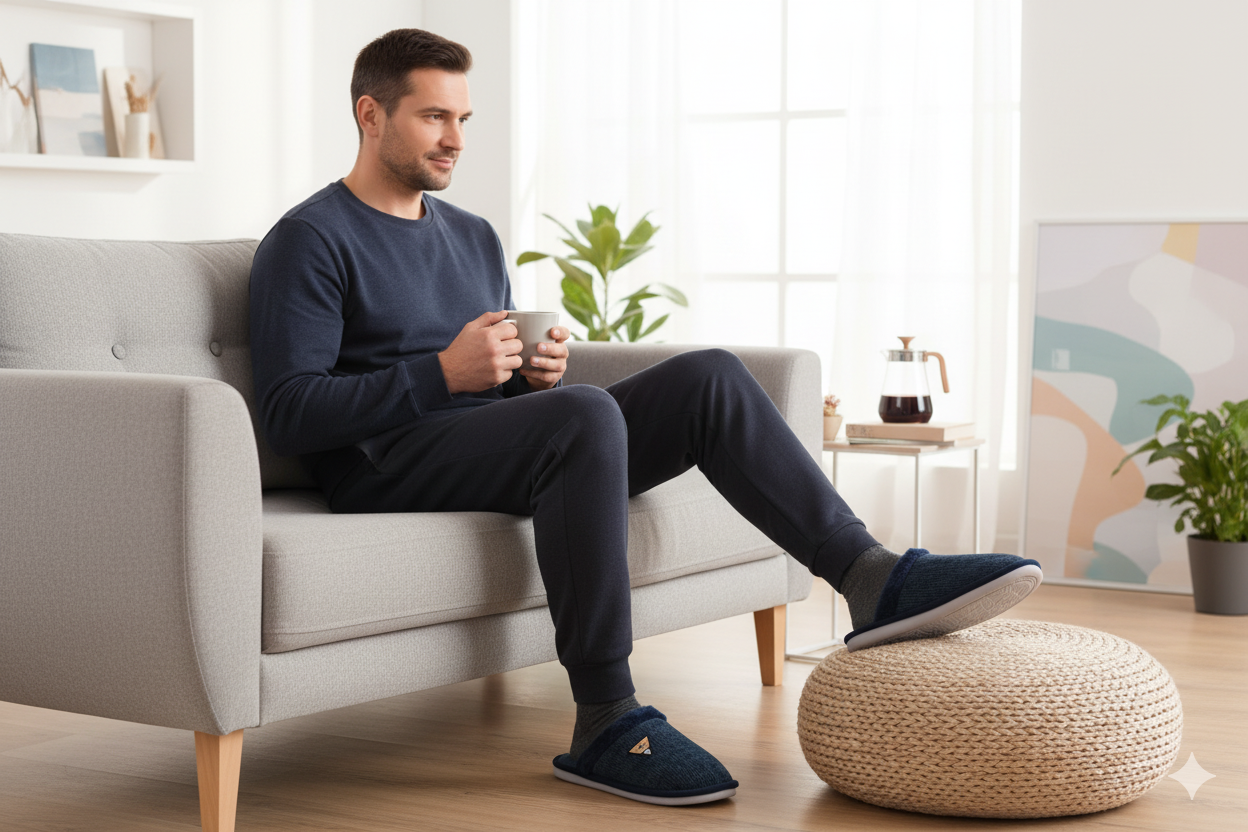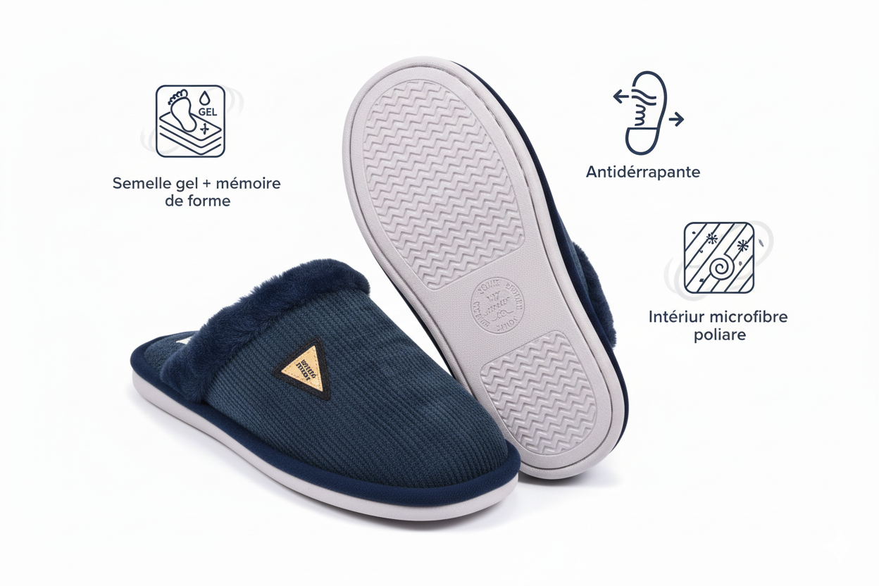 | Plus produit | Élégance du velours ondulé : Dessus raffiné en velours ondulé fin avec patch décoratif. Un design moderne et masculin qui allie sobriété, chaleur et allure contemporaine.Intérieur doux et réconfortant : Doublure microfibre polaire moelleuse procurant chaleur et confort durable. Sensation cocooning immédiate idéale pour l’hiver.Confort gel + mémoire de forme : Semelle intérieure associant mousse mémoire et gel amortissant. Adaptation parfaite à la forme du pied pour un confort sur mesure.Sécurité et stabilité renforcées : Semelle extérieure rigide en caoutchouc strié, antidérapante et durable. Assure une adhérence optimale sur tout type de sol. |