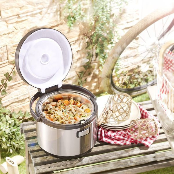tce610 - multicuiseur 5l 35w inox - Multicuiseur Thermal Cooker Siméo TCE610 économique et nomade.Eco-produit : 90% de consommation électrique économisée pour le même résultat.Nomade : débutez la cuisson à la maison, dégustez en balade, lors d?une sortie, un pique-nique, au travail, ?Totale sécurité : le thermal cookerpeut être laissé sans surveillance pour la cuisson passive.Cuisson en deux temps :1.Cuisson active : quelques minutes sur la plaque de cuisson, puis2.Cuisson passive : plusieurs heures dans le contenant isotherme.Contenant isotherme à double paroi avec matériau isolant haute densité pour une cuisson passive parfaitement régulée et homogène.Cuisson dans une cuve toute inox fond à 2 épaisseurs pour une répartition parfaitement uniforme de la chaleur et une qualité gustative assurée.Utilisation possible d?une seconde cuve capacité 1 litre pour des cuissons combinées.Cuves compatibles tous feux, y compris induction.Le couvercle inox permet de préserver la chaleur et de l?enfermer dans les cuves.La cuisson passive est douce, à basse température, respectueuse des aliments qui conservent toutes leurs qualités gustatives et un maximum de nutriments.Les aliments sont maintenus à température de dégustation durant plusieurs heures.La cuisson passive peut être secondée par un apport de chaleur pour allonger le maintien au chaud, soit sur secteur soit sur connexion 12 V (voiture, bateau, camping-car, ?).Poignée de transport pour déplacer facilement le produit.Cuve principale capacité 4L, idéal pour une utilisation familiale.