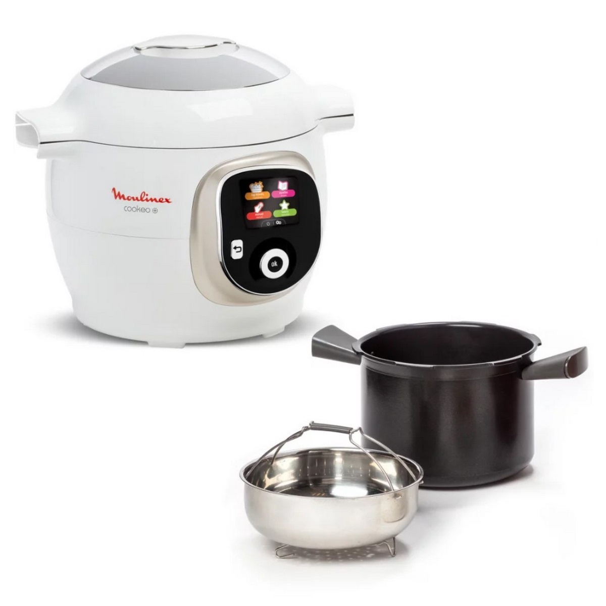 CE85BA10 - multicuiseur intelligent 6l 1600w blanc - Multicuiseur intelligent haute pression Cookeo+ 180 recettes Moulinex CE85BA10 : Prenez goût à une cuisine rapide et pleine d'idées ! Découvrez Cookeo, le multicuiseur intelligent haute pression dont vous ne pourrez plus vous passer en cuisine ! 180 recettes préprogrammées, pour cuisiner vite et bien vos plats quotidiens. Son écran intuitif vous guide pas à pas pour préparer parfaitement vos plats. Trouvez la recette parfaite à l'aide de l'application. Gagnez du temps avec le mode de cuisson sous pression, pour des repas prêts en un rien de temps et sans surveillance : le Cookeo+ relâche la pression et maintient vos plats au chaud automatiquement. De plus, avec 6 modes de cuisson, profitez chaque jour d'une grande variété de plats délicieux !