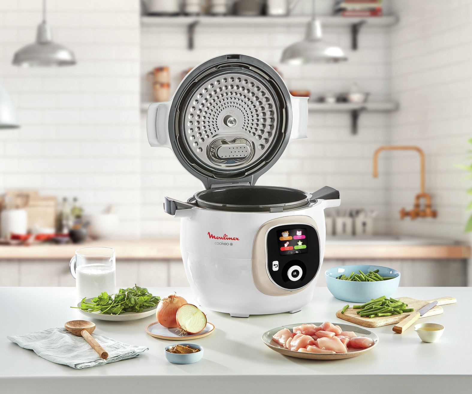 Le multicuiseur intelligent Cookeo+ est votre propre assistant culinaire. Grâce à ses quatre menus interactifs, il vous accompagne pas à pas pour réaliser de bons petits plats, simples et rapides : Menu ingrédients : Si vous souhaitez cuisiner un ingrédient spécifique, il vous suffit de le choisir sur l'écran numérique, de cliquer, et Cookeo le cuit pour vous. Menu recettes : Contenant 150 recettes préprogrammées sucrées et salées, le multicuiseur Cookeo vous guide pas à pas pour réaliser de délicieux plats pour un maximum de 6 personnes. Menu manuel : Cuisinez vos propres recettes grâce à ses différents réglages de cuisson. Sans surveillance, il demeure sûr et garde les aliments au chaud une fois cuits et jusqu'au moment de passer à table! Menu favoris : Vos plats préférés à votre portée. En plus des 500 recettes officielles Moulinex, retrouvez toutes ces nouvelles recettes grâce au filtre "Communauté" pour trouver chaque jour l'inspiration. Toutes les recettes dont vous avez besoin sont dans votre poche! Commentez, évaluez et partagez vos recettes préférées. Déjà plus de 2500 recettes dans l'application!