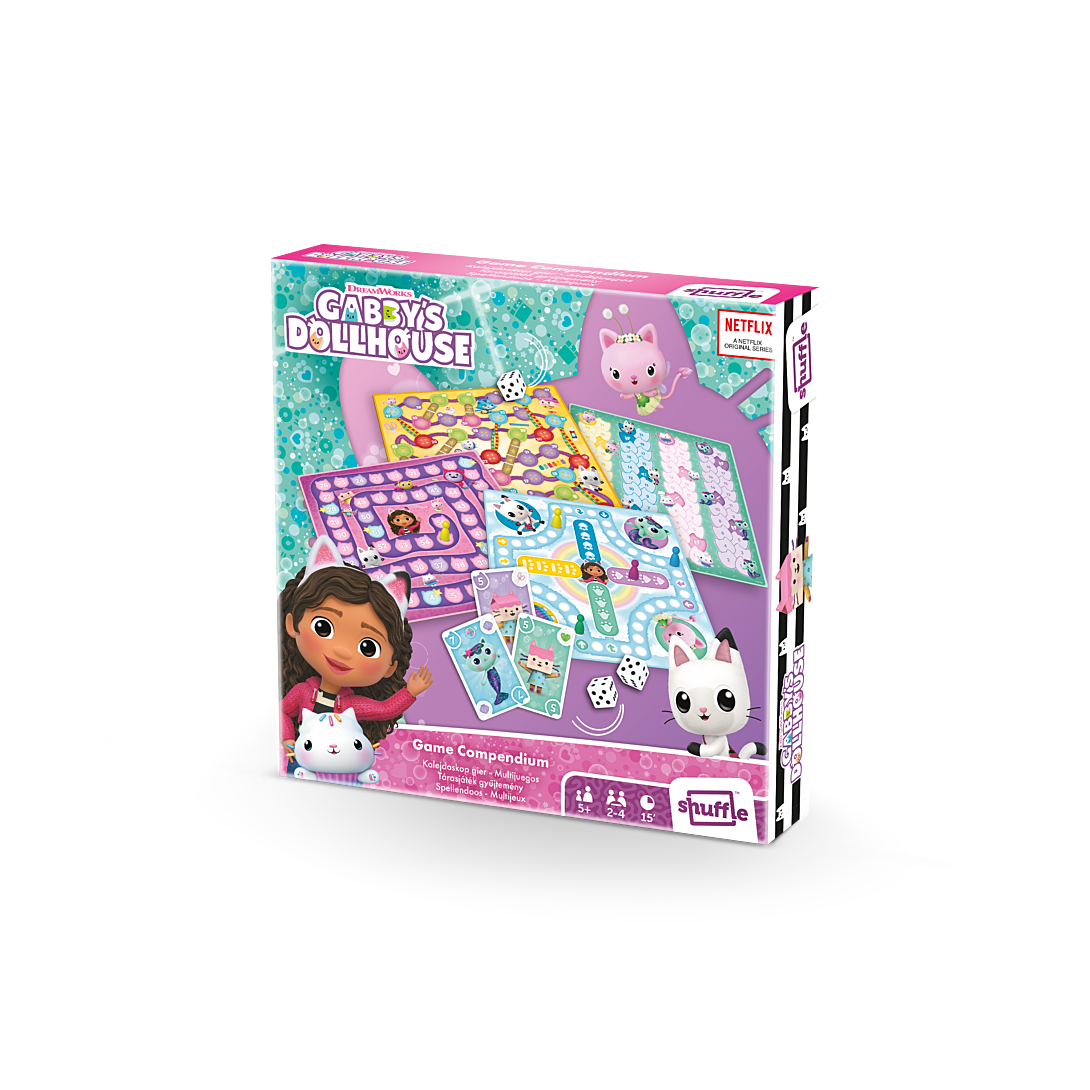 Entrez dans l'univers coloré de Gabby et la maison magique avec ce multijeux comprenant 4 plateaux de jeux et nombreux accessoires pour jouer à vos jeux traditionnels préférés ! Tout est adapté à l'univers Gabby, c'est tellement plus chatastique! Retrouvez les petits chevaux, le Jeu d'échelle, jeu de l'oie, un jeu de 36 cartes pour jouer au pouilleux, au menteur, au mémory... tous ces jeux n'auront plus de secret pour vous. De nombreuses autres règles sont disponibles sur la notice de jeu. Contient: 4 plateaux de jeux, un jeu de 36 de cartes, 16 pions, 3 dés. A partir de 5+, à partir de 2 joueurs et +, environ 20 mn de jeux