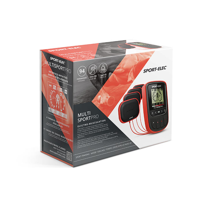 Multisport pro muscles longs ce stimulateur musculaire complet et unisexe à modules dispose des catégories << sport >> et << santé >>. grâce aux électrodes exportées, vous pourrez travailler de façon efficace les muscles longs tels que les cuisses, omoplates, dorsaux... 94 programmes le stimulateur musculaire a des programmes adaptés en fonction des objectifs (musculation, récupération, échauffement, anti-douleur, ...) et en fonction des zones : ce qui permet aux 8 programmes de la catégorie <> de représenter 88 programmes grâce à la sélection parmi les 11 zones musculaires différentes ; et 6 programmes << santé >> qui sont pour toutes les zones. 4 canaux le multisport pro possède une haute performance grâce à ses 4 canaux chacun muni d'un connecteur où se fixe une électrode double et qui permettent de travailler jusqu'à 4 zones musculaires simultanément. batterie rechargeable batterie interne rechargeable avec le chargeur secteur (fourni). electrodes doubles exportees l'électrode double exportée équivaut à 2 électrodes classiques, elles sont spécialement adaptées pour travailler les muscles longs. interface simple et intuitive tous les éléments indispensables pour une utilisation simplifiée du boîtier sont visibles sur l'écran: - niveau de charge de la batterie - affichage du numéro de programme choisi - affichage de la durée de programme restant - option muscles alternés, vous choisissez de faire travailler 2 groupes musculaires en alternance - option muscles simultanés (choix par défaut) - phase d'échauffement - les programmes sport - les programmes santé - les zones musculaires 6 programmes santé 88 programmes sport (8 programmes différents pour 11 zones)
