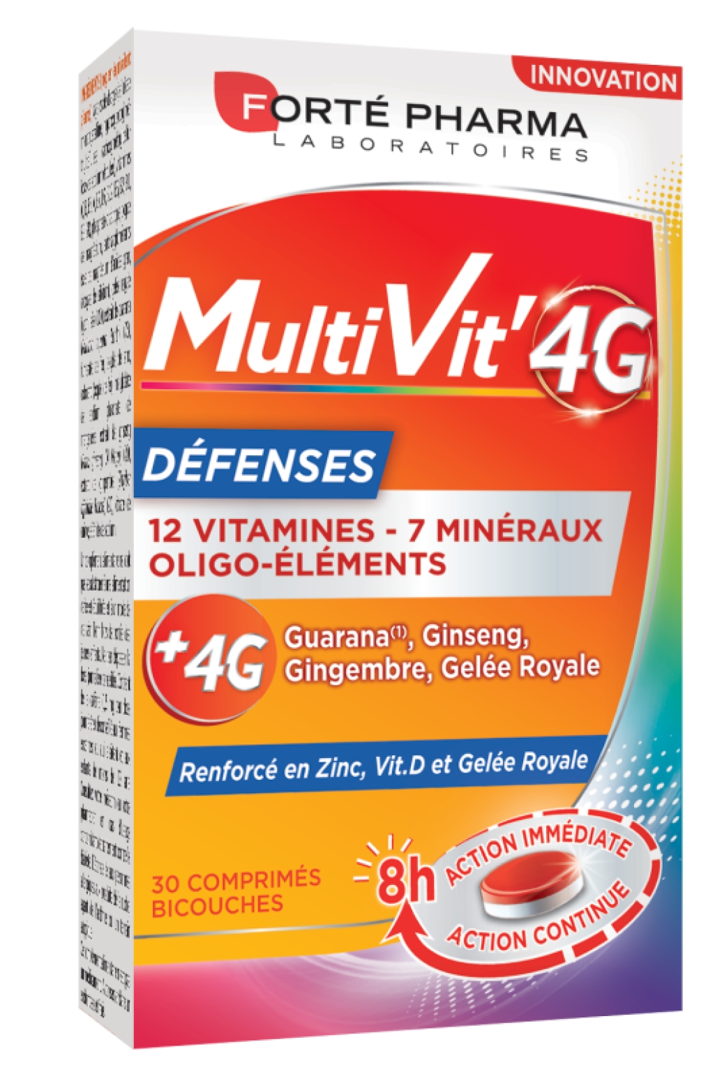 Lors des changements de saison et particulièrement à l’approche de l’hiver, en période de convalescence ou dès les premiers signes de coup de froid ou de fatigue, vous avez besoin de retrouver de l’énergie tout en renforçant votre organisme pour résister aux agressions de l‘hiver ? MultiVit’4G DÉFENSES a été spécialement développé par le département Recherche et Développement des Laboratoires Forté Pharma, pour couvrir vos besoins quotidiens en vitamines, minéraux et oligo-éléments. Sa formule très complète associe : • 12 Vitamines, dosées à 100% minimum des valeurs nutritionnelles recommandées, • 7 Minéraux et oligo-éléments, essentiels au bon fonctionnement de notre organisme, • Le complexe de plantes dynamisantes 4G : Ginseng, Guarana, Gelée royale et Gingembre. MultiVit’4G DÉFENSES est renforcé en Vitamine D et en Zinc qui contribuent au bon fonctionnement du système immunitaire, et en Gelée royale, concentré nutritif destiné à nourrir la reine des abeilles, lui offrant une incroyable longévité. MultiVit'4G a été développé en comprimé bicouche double libération : • Une libération immédiate des plantes dynamisantes 4G pour un coup de pouce matinal, • Une libération prolongée sur 8 heures des vitamines et minéraux pour rester en forme tout au long de la journée. Activez votre vitalité et renforcez vos défenses immunitaires pour rester en forme au quotidien, avec MultiVit’4G DÉFENSES !