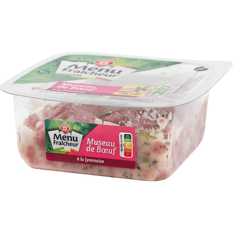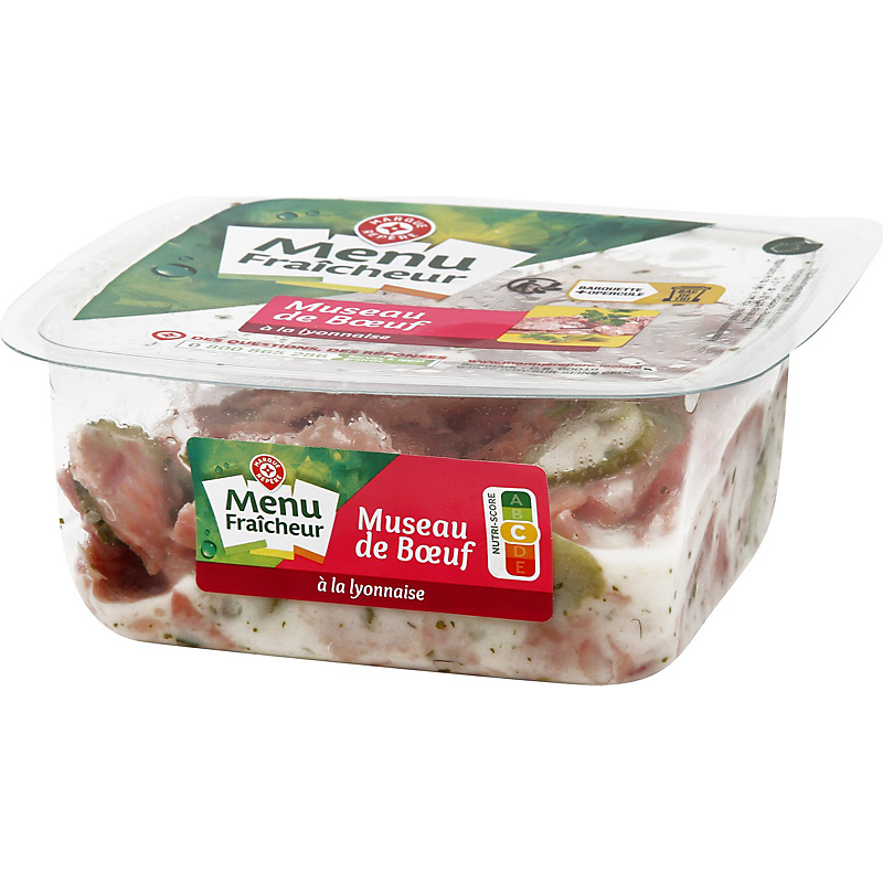 Ingrédients : Museau de bœuf 61% (pièces de tête de bœuf, eau, sel, vinaigre d'alcool, dextrose, sucre, acidifiants : acide citrique ; acide lactique, antioxydants : E316 ; acide ascorbique, conservateur : E250) ; eau ; oignon ; cornichon 9,5% ; huile de colza ; vinaigre d'alcool ; sel ; moutarde (eau, graine de moutarde, vinaigre d'alcool, sel) ; amidon modifié de pomme de terre ; persil déshydraté ; épaississant : gomme xanthane ; poivre.