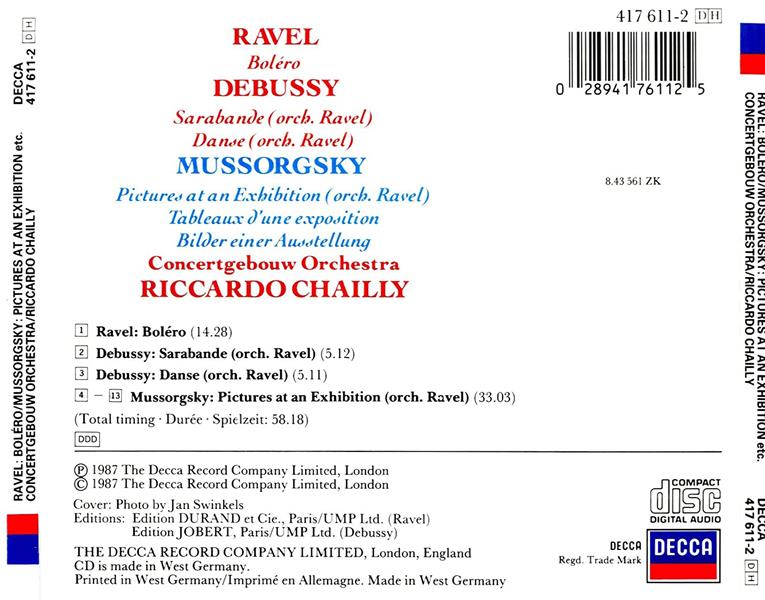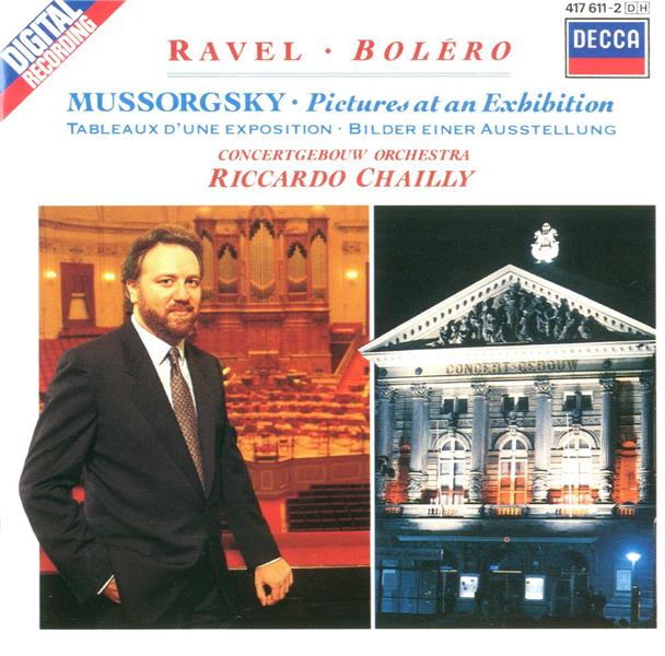| Liste des pistes | 1.1 . boléro, m. 81 - Chailly, Riccardo,Royal Concertgebouw Orchestra 1.2 . sarabande - Chailly, Riccardo,Royal Concertgebouw Orchestra 1.3 . danse (tarantelle styrienne), l. 69 - Chailly, Riccardo,Royal Concertgebouw Orchestra 1.4 . promenade - gnomus - Chailly, Riccardo,Royal Concertgebouw Orchestra 1.5 . promenade - the old castle - Chailly, Riccardo,Royal Concertgebouw Orchestra 1.6 . promenade - tuileries - Chailly, Riccardo,Royal Concertgebouw Orchestra 1.7 . bydlo - promenade - Chailly, Riccardo,Royal Concertgebouw Orchestra 1.8 . ballet of the chickens in their shells - Chailly, Riccardo,Royal Concertgebouw Orchestra 1.9 . samuel goldenberg and schmuyle - Chailly, Riccardo,Royal Concertgebouw Orchestra 1.10 . the market place at limoges - Chailly, Riccardo,Royal Concertgebouw Orchestra 1.11 . catacombae - cum mortuis in lingua mortua - Chailly, Riccardo,Royal Concertgebouw Orchestra 1.12 . the hut on fowl's legs (baba-yaga) - Chailly, Riccardo,Royal Concertgebouw Orchestra 1.13 . the great gate of kiev - Chailly, Riccardo,Royal Concertgebouw Orchestra |