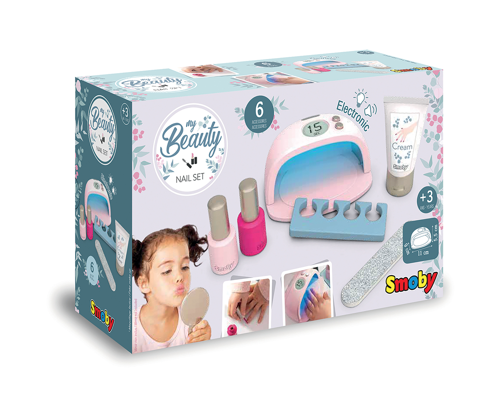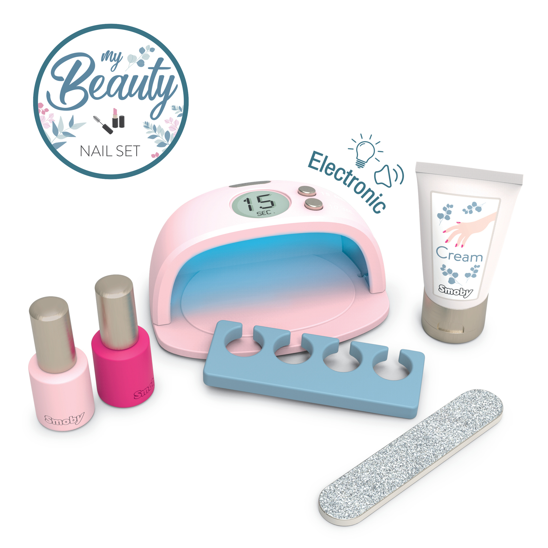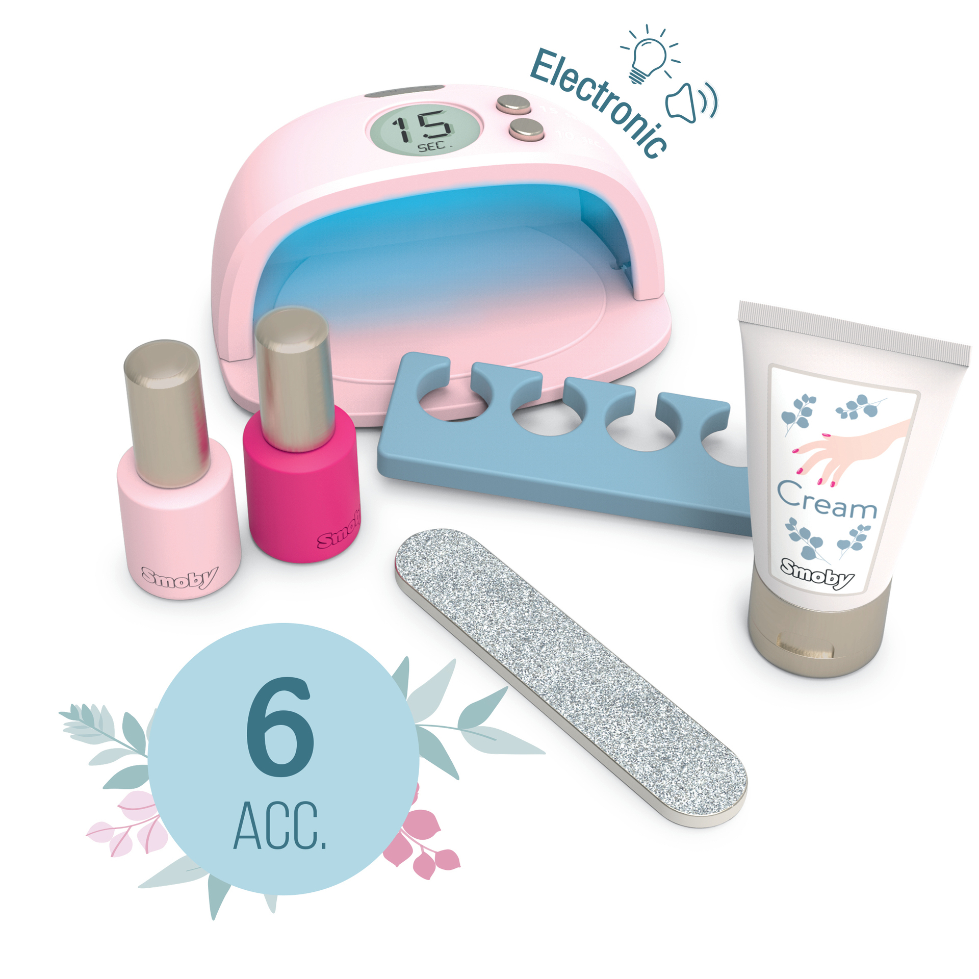 Set beauté composé de 2 vernis, d'un séparateur d'orteils, d'une lime à ongles, d'une crème pour les mains, et d'une lampe UV électronique (avec son et lumière).
