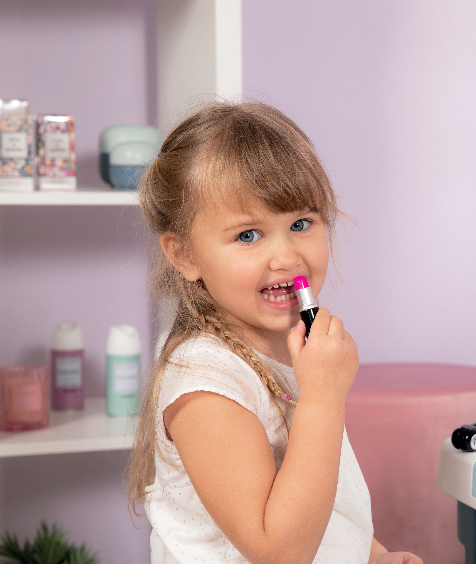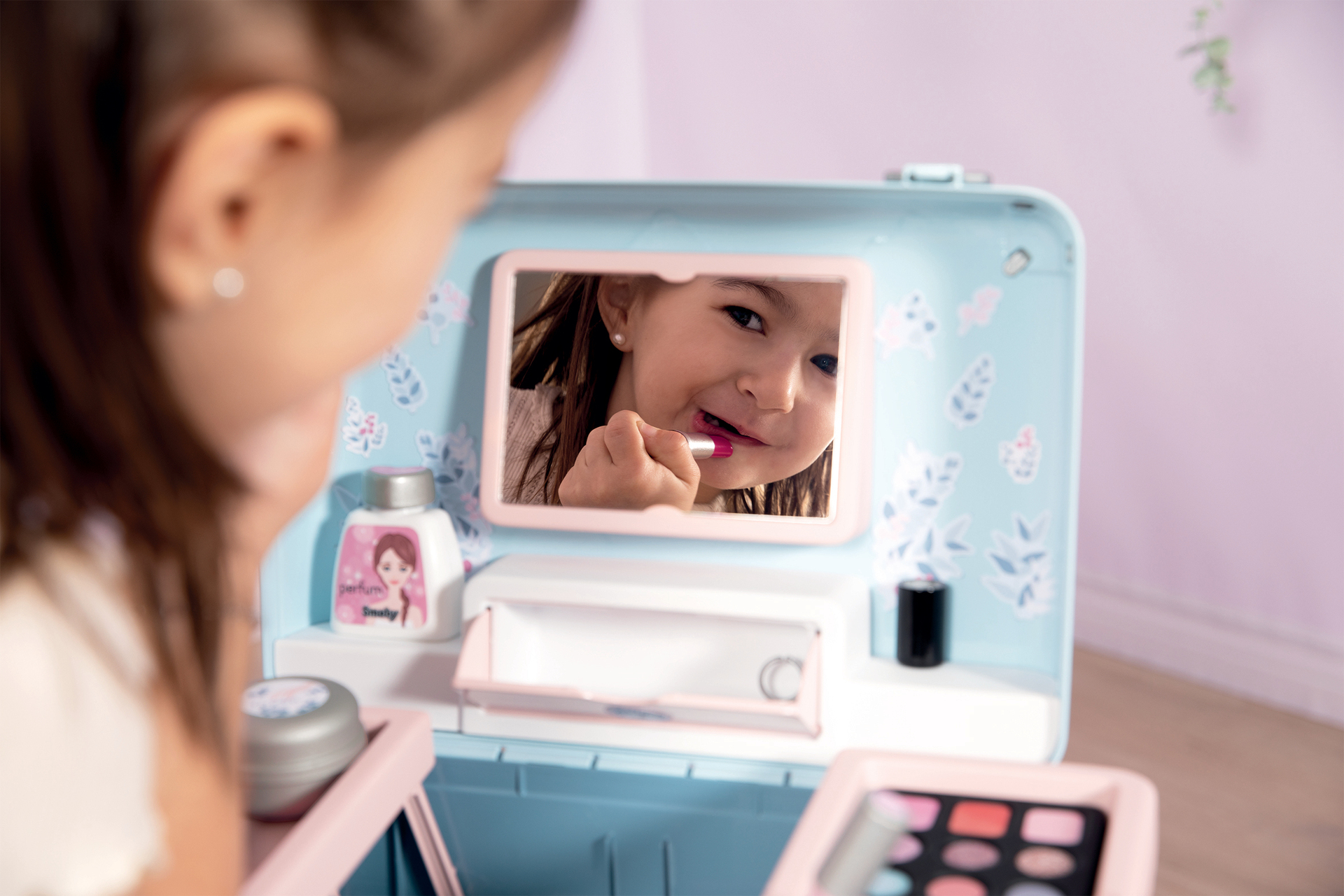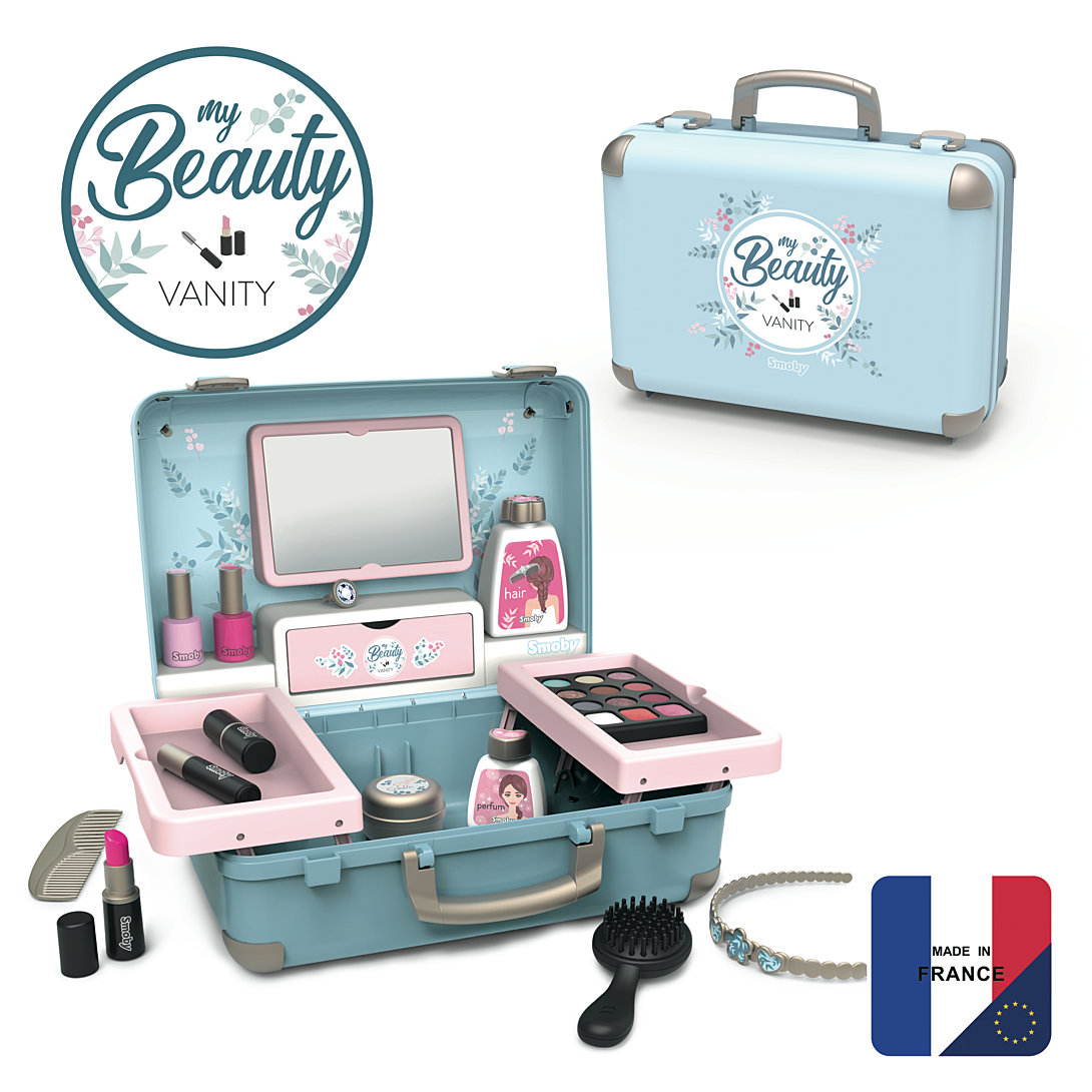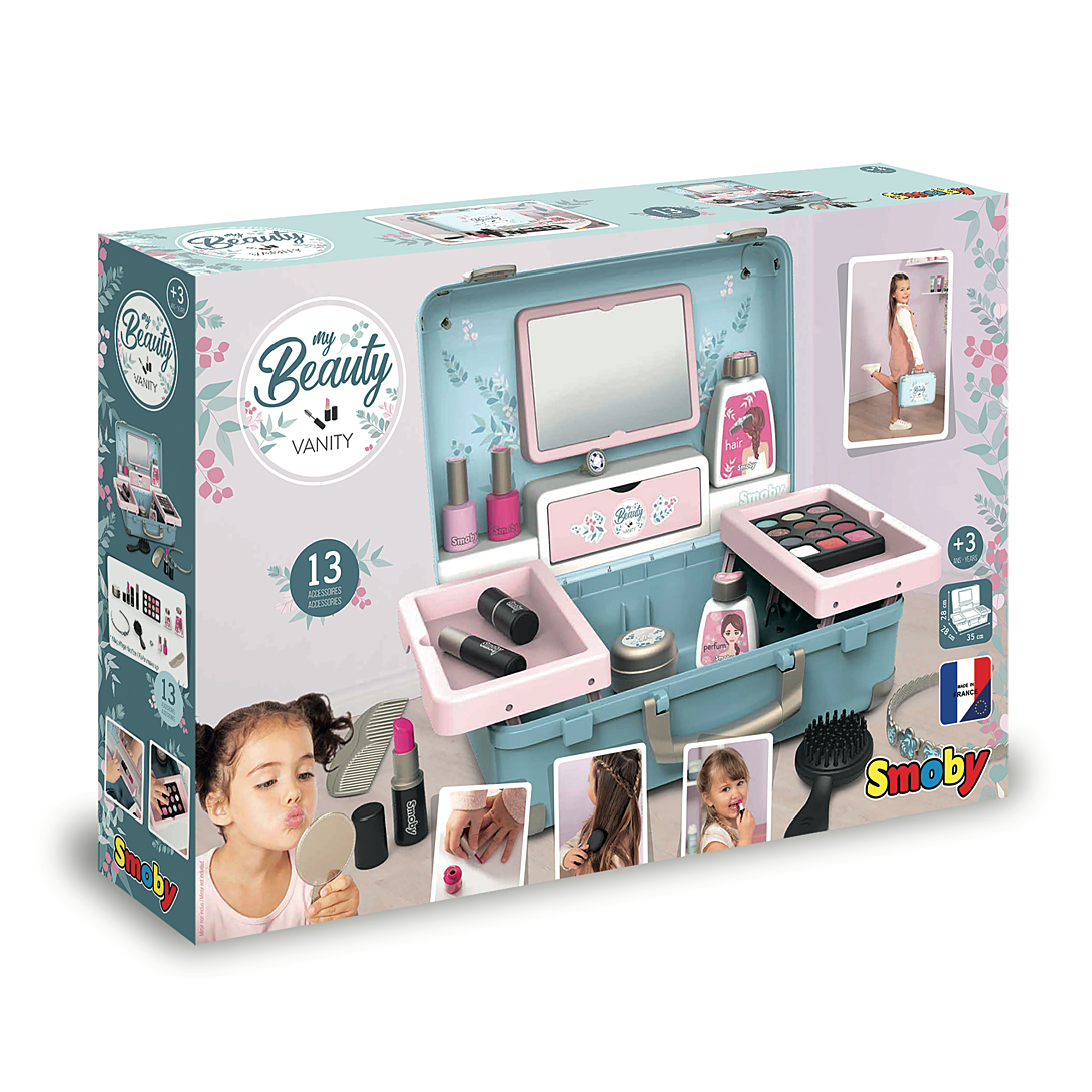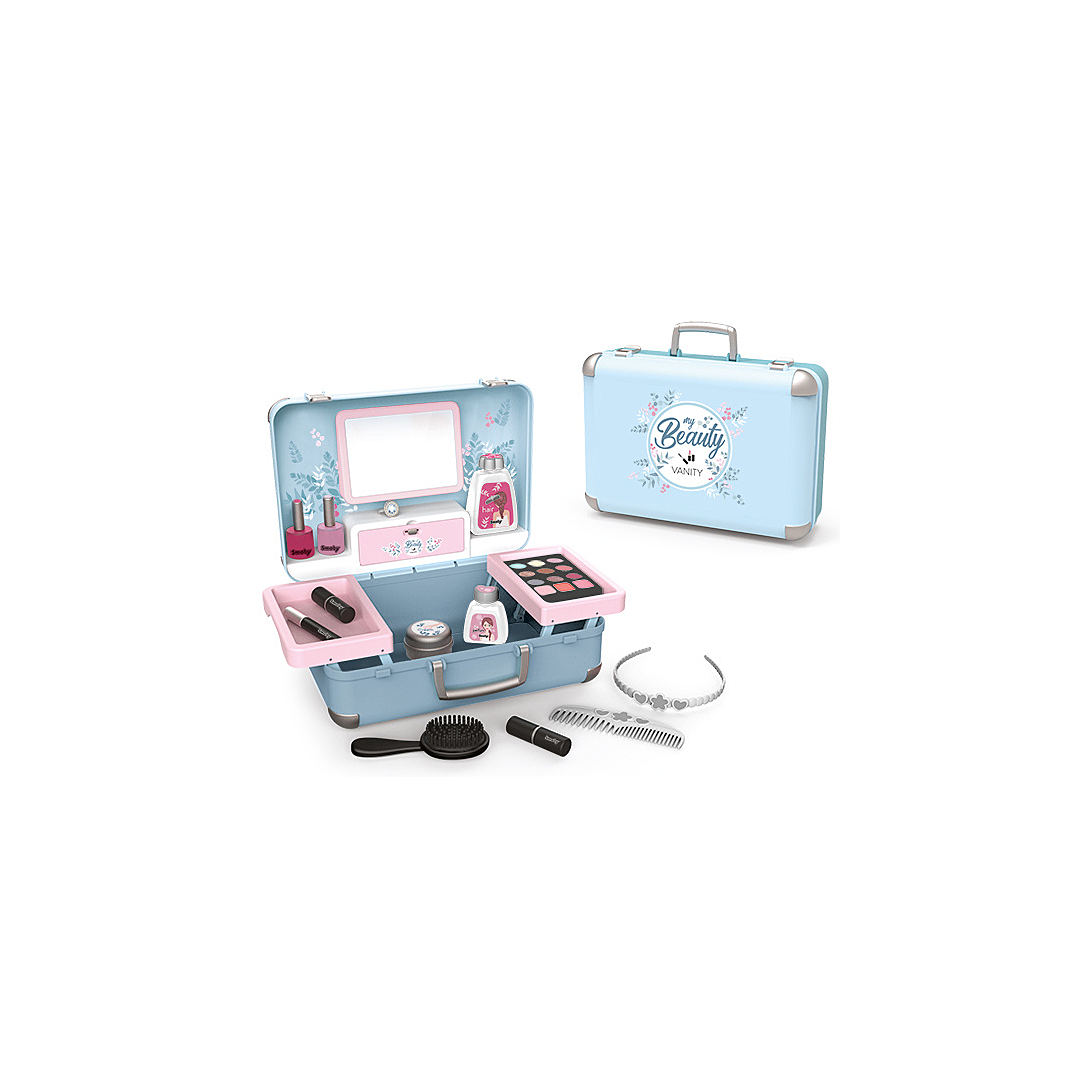 Vanity compact. 3 univers : coiffure, onglerie, maquillage. 13 accessoires : 2 vernis, 2 rouges à lèvres, 1 palette de fards à paupières,1 mascara, 1 brosse, 1 peigne, 1 serre-tête, 1 bague, et différents flacons.1 vrai miroir et 1 trappe secrète sont inclus.