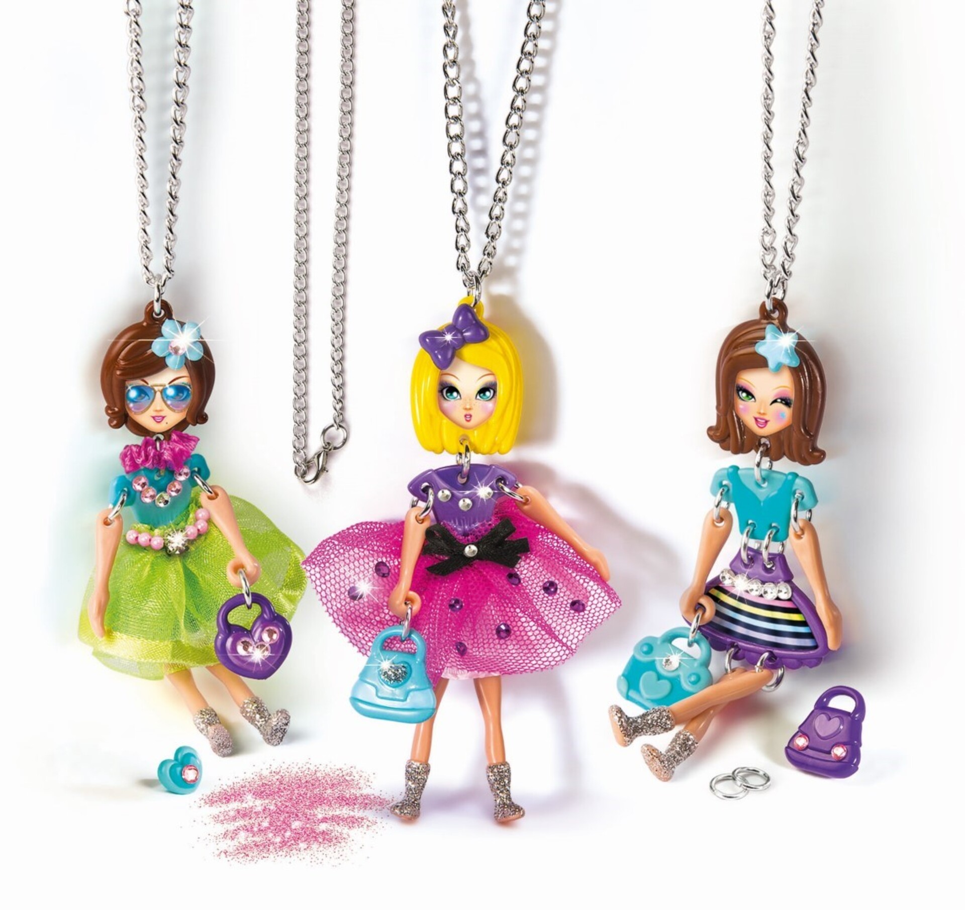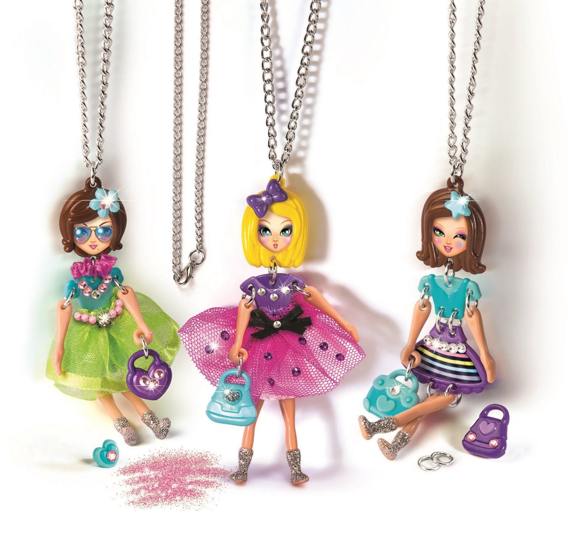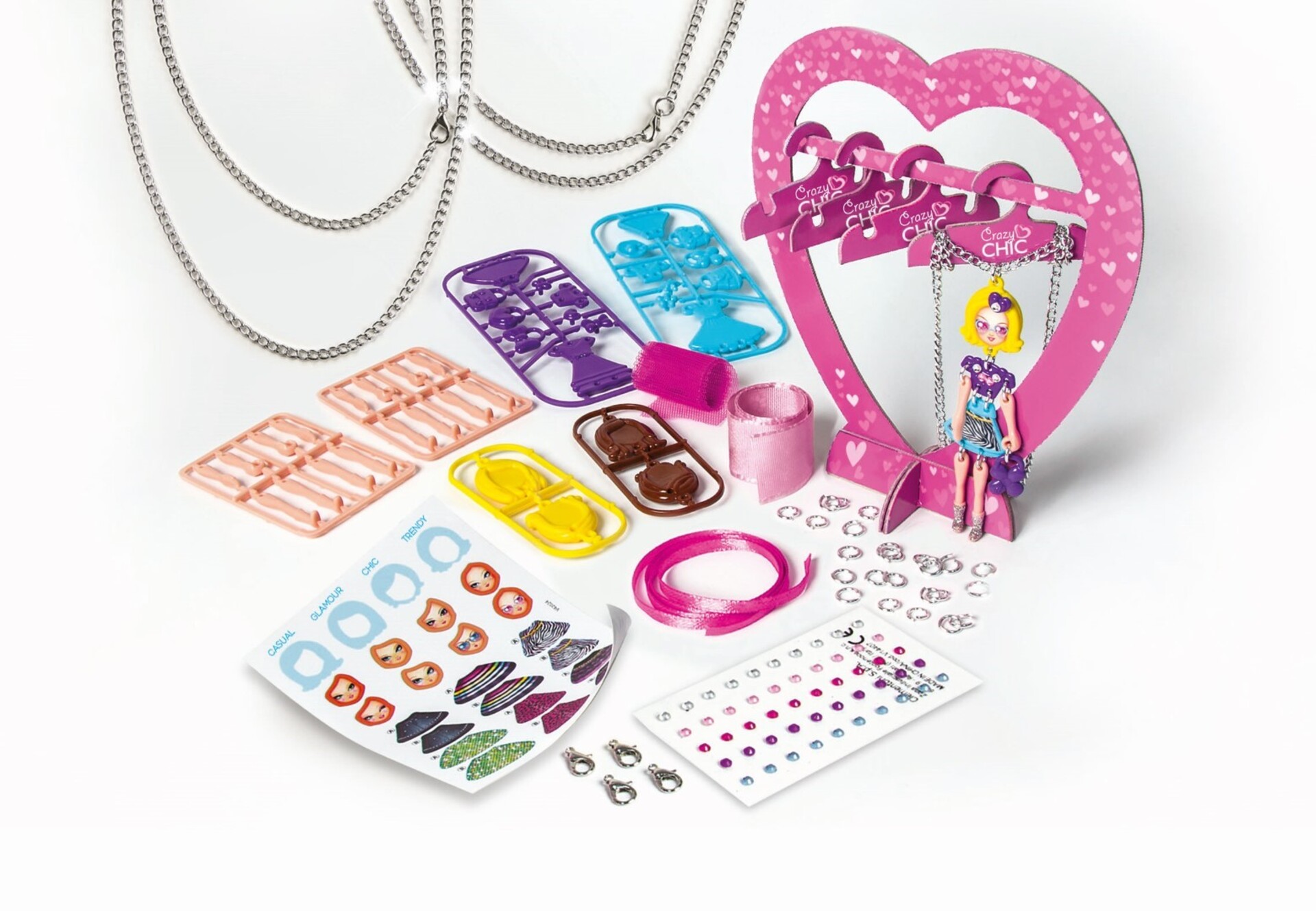 Un coffret exclusif pour créer des pendentifs en forme de poupée : 4 poupées Crazy Chic pour un style unique et original ! Les jeunes fashionistas peuvent assembler les formes, les joindre aux anneaux métalliques pour construire le corps, créer des robes en tulle, des rubans et compléter les tenues avec des autocollants et des accessoires. Contient également un support pour colliers à assembler, pour y ranger toutes tes créations.