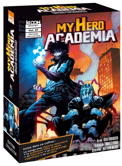 Coffret regroupant le guide et le tome 27 de la série My hero academia ainsi qu'un calendrier, un marque-page magnétique et un ex-libris.