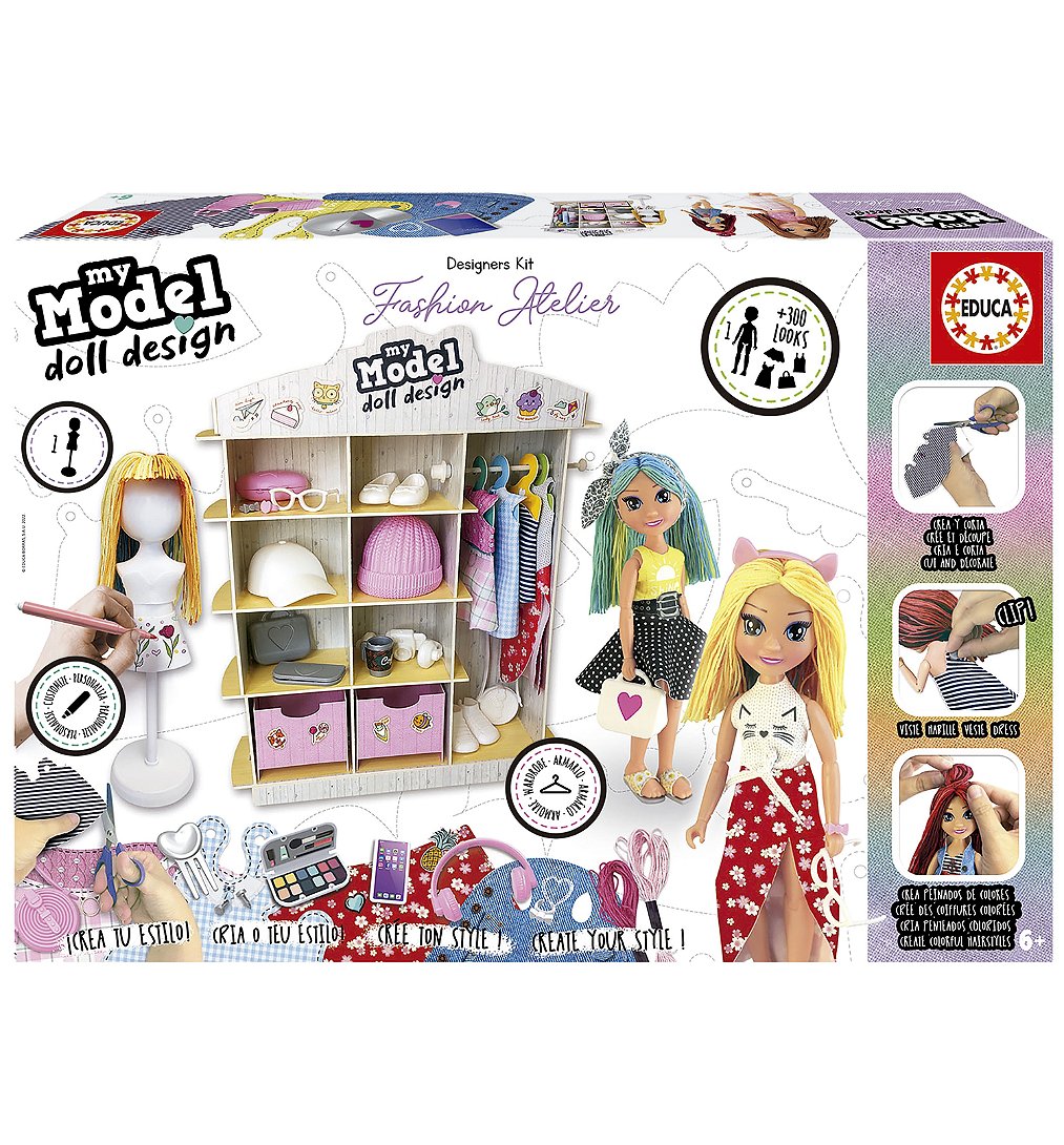 | La boîte contient | Contenu : - 1 poupée articulée à assembler - Tissu avec des motifs pré-imprimés - Tissu avec des motifs non imprimés - Accessoires de mode - Pinces à vêtements - 2 sacs de laine pour les cheveux - 1 outil de perforation, 1 mannequin à assembler, 1 garde-robe à assembler - Autocollants - Instructions en ESP/FR/PT/PT/ND/EN. |