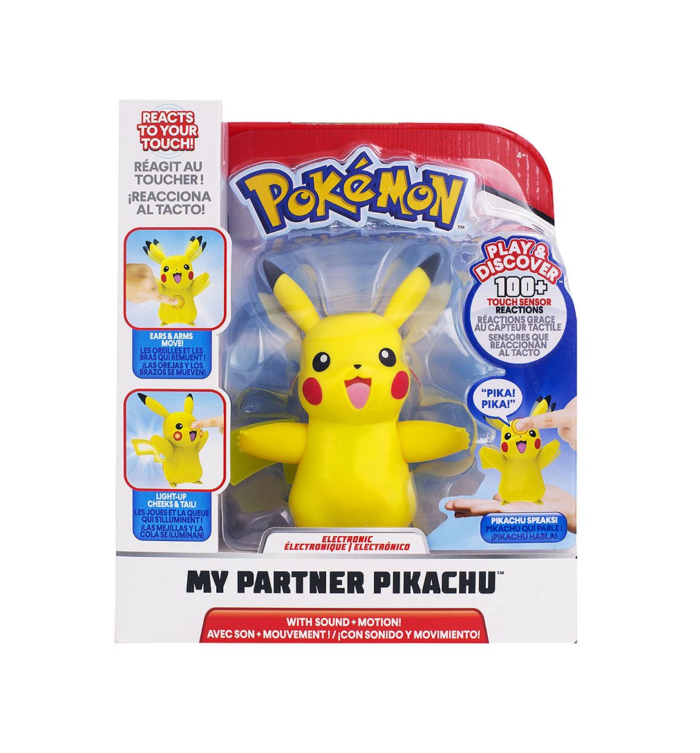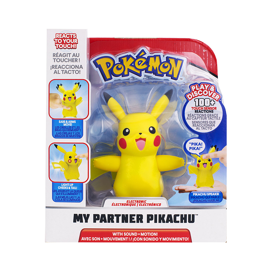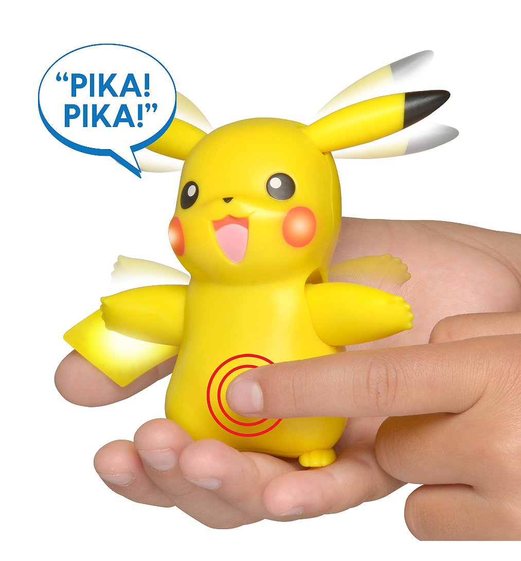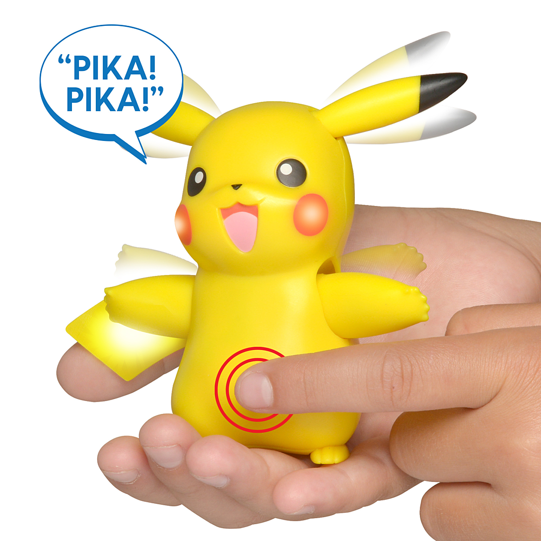 Incroyable, Pikachu prend vie à ton contact… Touche la tête et le nez de Pikachu afin qu'il active ses fonctions. Différentes réactions. Il parle, bouge ses bras et ses oreilles et peut également se déplacer. Un vrai compagnon intéractif que tu peux emporter partout avec toi !