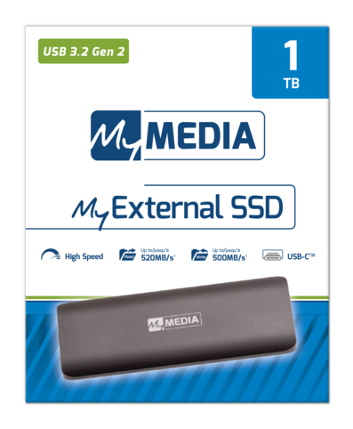 MyMedia MyExternal SSD. Capacité du Solid State Drive (SSD): 1 To, Facteur de forme SSD: M.2. Connecteur USB: USB Type-C, Version USB: 3.2 Gen 2 (3.1 Gen 2). Vitesse de lecture: 520 Mo/s, Vitesse d'écriture: 500 Mo/s. Couleur du produit: Gris