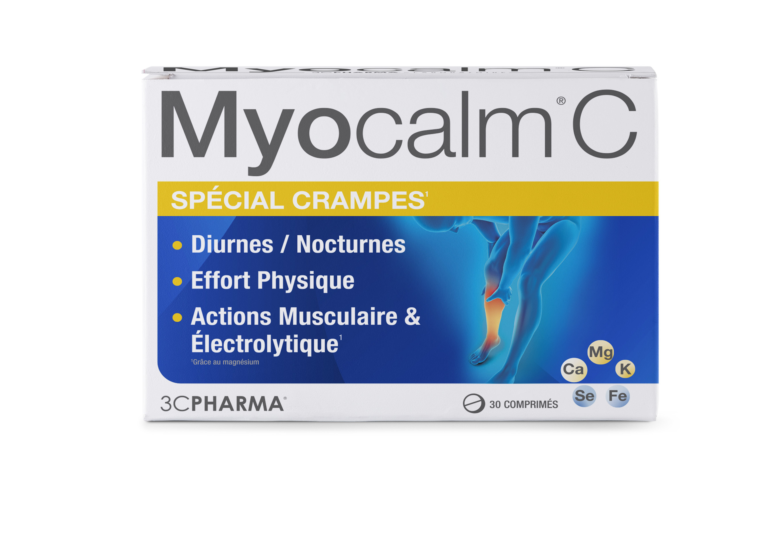 Myocalm® C, élaboré à base d’un complexe minéral synergique, agit conjointement sur la physiologie des contractions musculaires et sur les muscles eux-mêmes. Sa double action prévient et soulage rapidement tous types de contractions musculaires involontaires : crampes incontrôlées diurnes et/ou nocturnes ou suite à un effort physique. Myocalm® C est efficace sur tous types de crampes : ponctuelles ou systématiques. Convient aux femmes enceintes