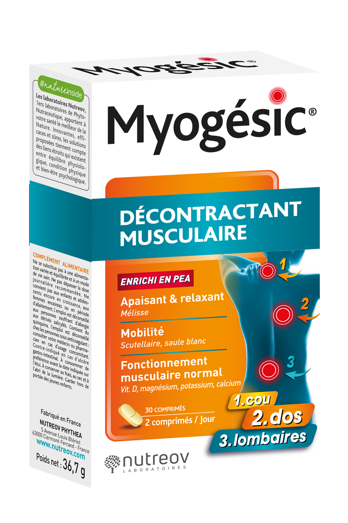 Myogésic est un complément alimentaire indiqué pour apaiser et relaxer les contractures musculaires du dos, des cervicales et des lombaires. Il facilite la mobilité et rétablit un fonctionnement musculaire normal. La Mélisse apaise et relaxe, Le Scutellaire et le Saule Blanc pour la mobilité, la Vitamine D, le Magnésium, le Potassium et la Calcium pour un fonctionnement musculaire normal.
