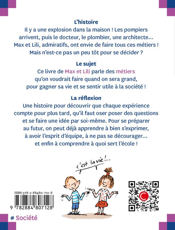 Il y a une explosion dans la maison ! Les pompiers arrivent, puis le docteur, le plombier, une architecte... Max et Lili, admiratifs, ont envie de faire tous ces métiers ! Mais n'est-ce pas un peu tôt pour se décider ?
