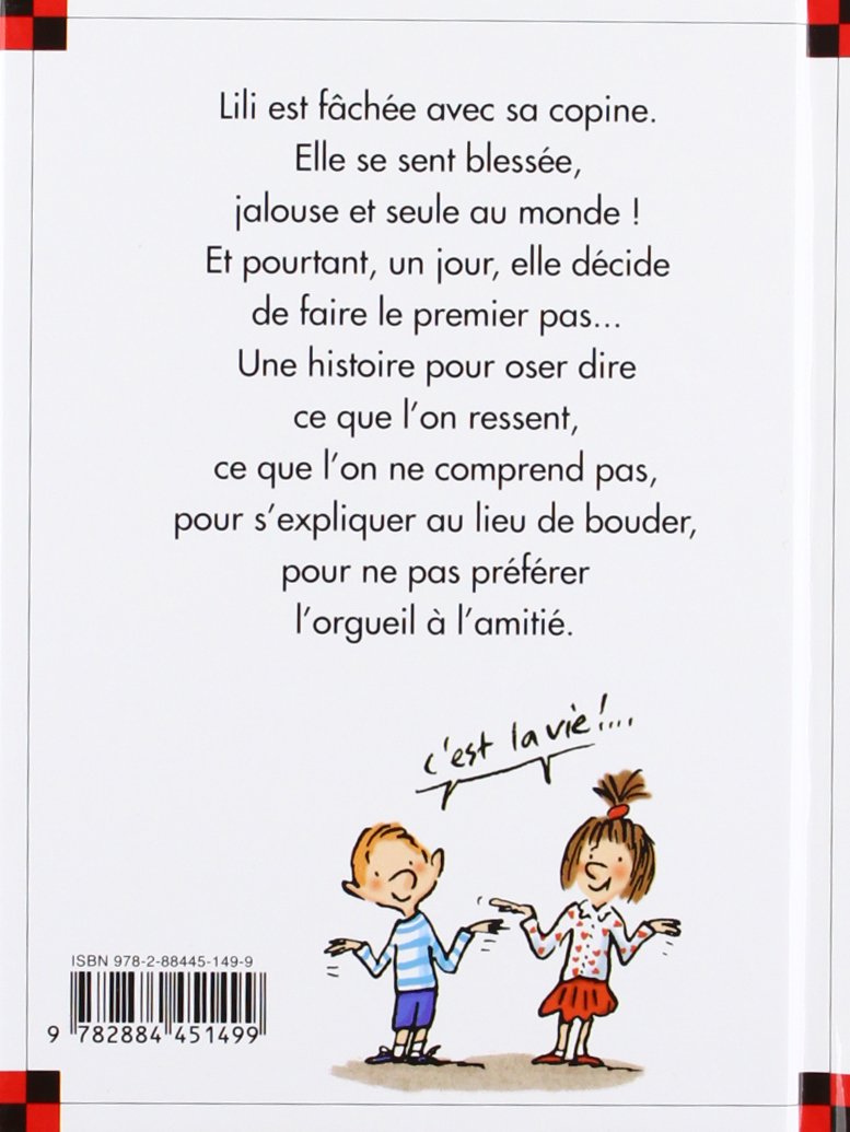 Lili est fâchée avec sa copine. Elle se sent blessée, jalouse et seule au monde ! Et pourtant, un jour, elle décide de faire le premier pas... Une histoire pour oser dire ce que l'on ressent, ce que l'on ne comprend pas, pour s'expliquer au lieu de bouder, pour ne pas préférer l'orgueil à l'amitié.