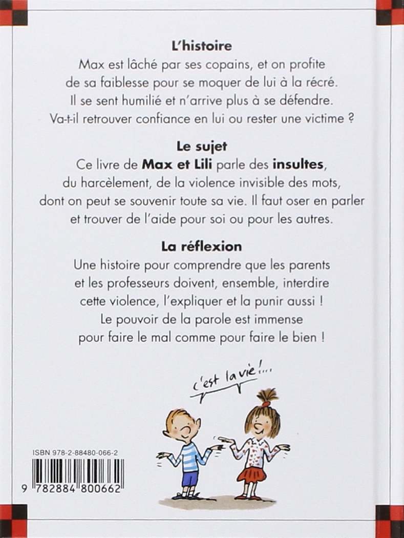 Ce livre de Max et Lili parle des insultes, de la violence invisible des mots, dont on peut se souvenir toute sa vie. L'enfant doit y faire face sans avoir peur d'en parler, trouver des copains ou des adultes qui le soutiennent et pensent du bien de lui. Les parents et les professeurs peuvent, ensemble, interdire cette violence, l'expliquer et la punir aussi! Le pouvoir de la parole est immense pour faire le mal comme pour faire le bien!