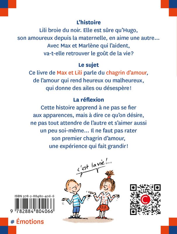 Ce livre de Max et Lili parle du chagrin d'amour, de l'amour qui rend heureux ou malheureux, qui donne des ailes ou désespère ! Cette histoire montre qu'il ne faut pas se fier aux apparences, un malendendu est vite arrivé, qu'il faut s'aimer un peu soi-même, dire ce qu'on désire et ne pas tout attendre de l'autre... Le chagrin d'amour, en tout cas, est une expérience qui fait grandir !