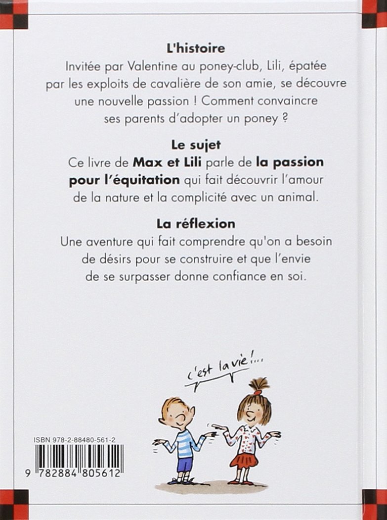 Lili est pleine d'admiration pour Valentine et ses exploits de cavalière. Et le jour où elle l'invite à son poney-club, Lili se laisse emporter par sa nouvelle passion, avec une seule idée en tête : adopter un poney ! Mais comment convaincre ses parents ?!! Ce livre de Max et Lili parle de la passion du cheval, qui fait découvrir l'amour de la nature, la complicité avec un animal, le plaisir de partager avec lui des sensations, des peurs ; une aventure qui peut donner confiance en soi et envie de se surpasser. Il fait comprendre aussi que chaque cheval a son caractère et que chaque enfant, pour se construire, a droit à ses passions, ses découvertes, ses renoncements ou ses coups de foudre !