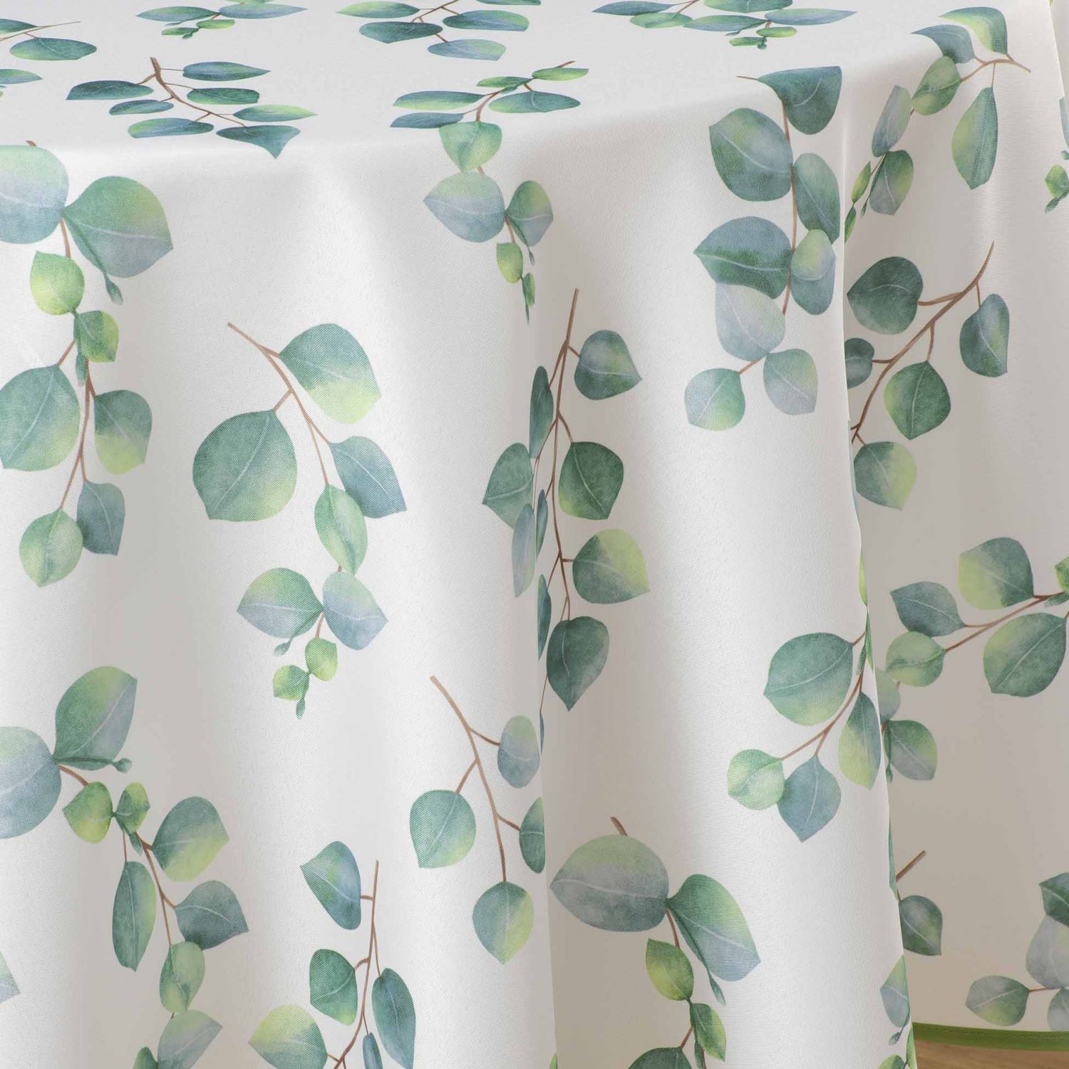 Nappe antitache infroissable ronde imprimée eucalyptus vert sur fond blanc.