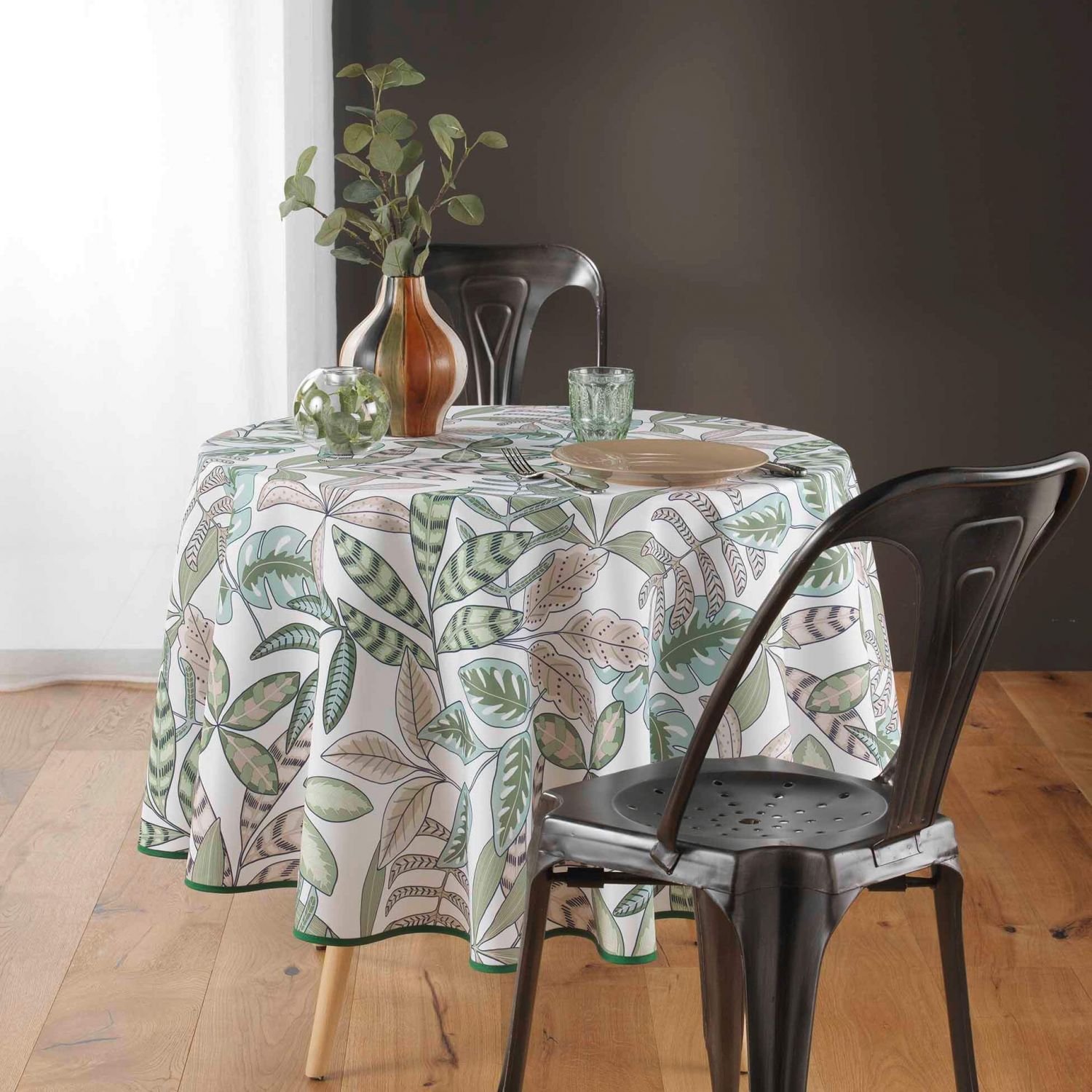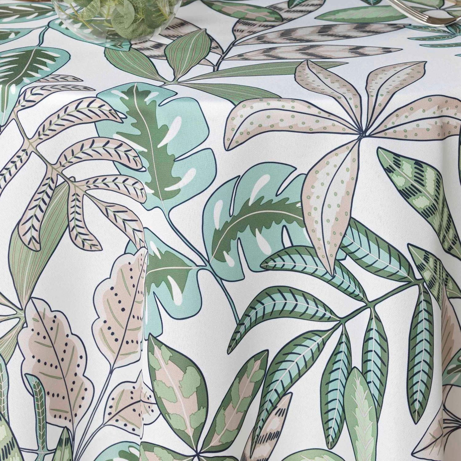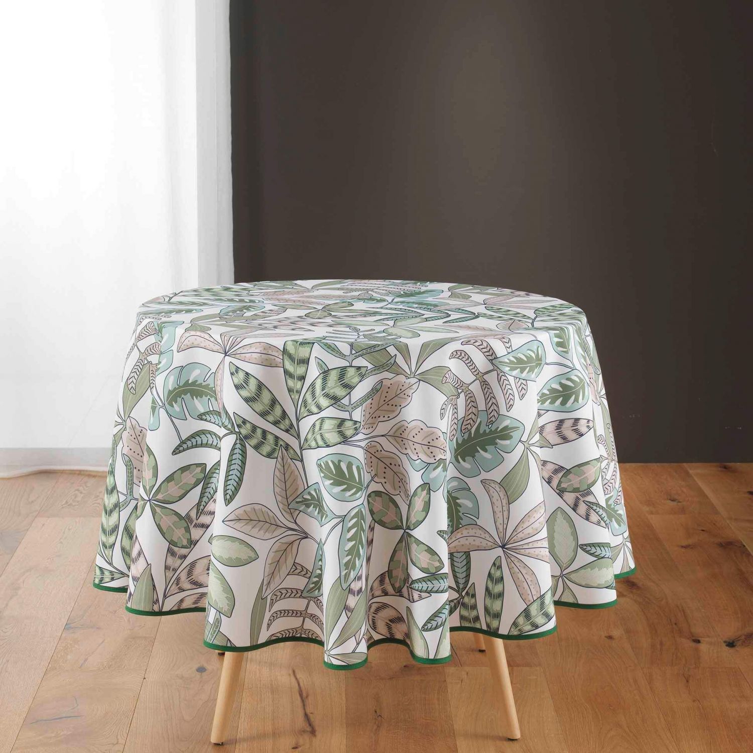 Nappe antitache infroissable ronde ambiance feuillage coloris vert, blanc et beige.