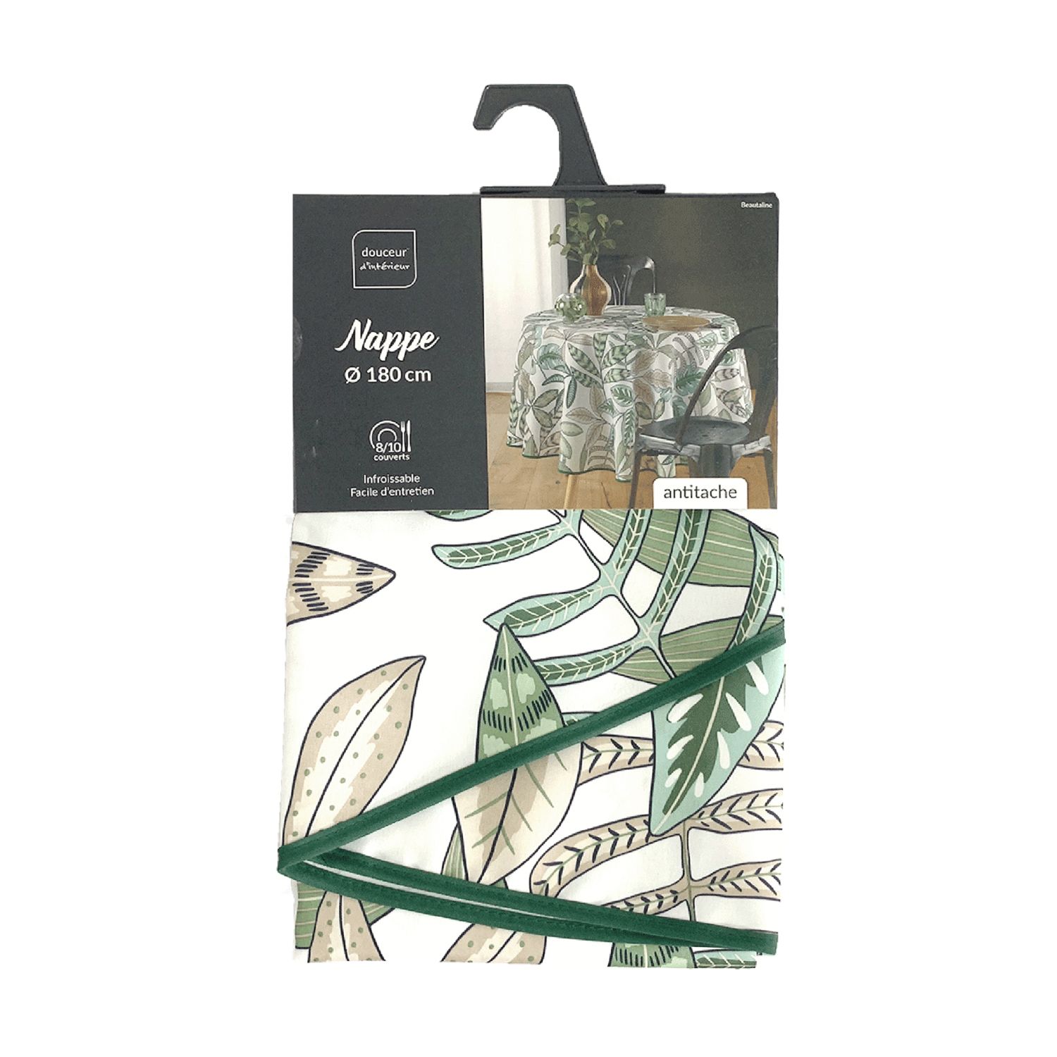 | Libellé | Nappe antitache ronde - Diamètre 180 cm - Feuillage Vert et Beige |
