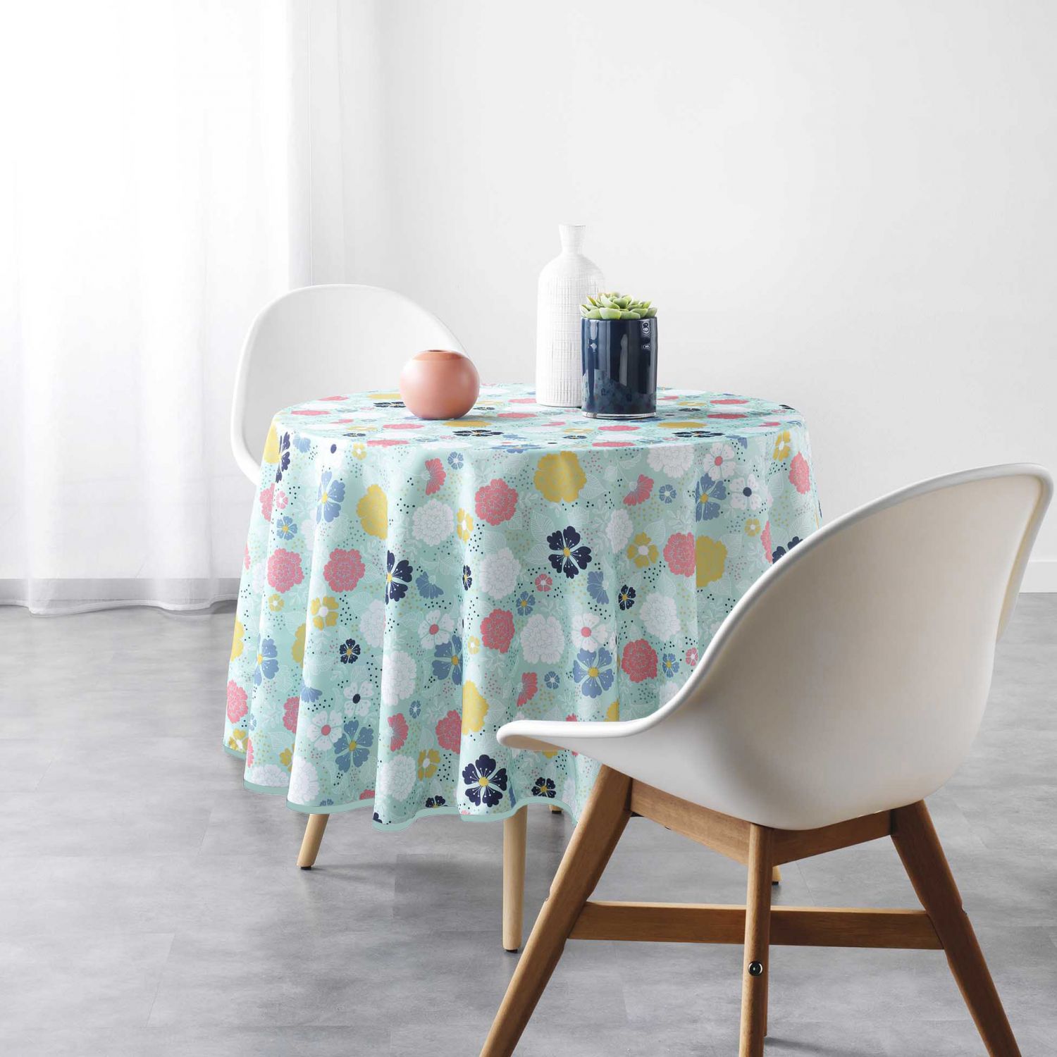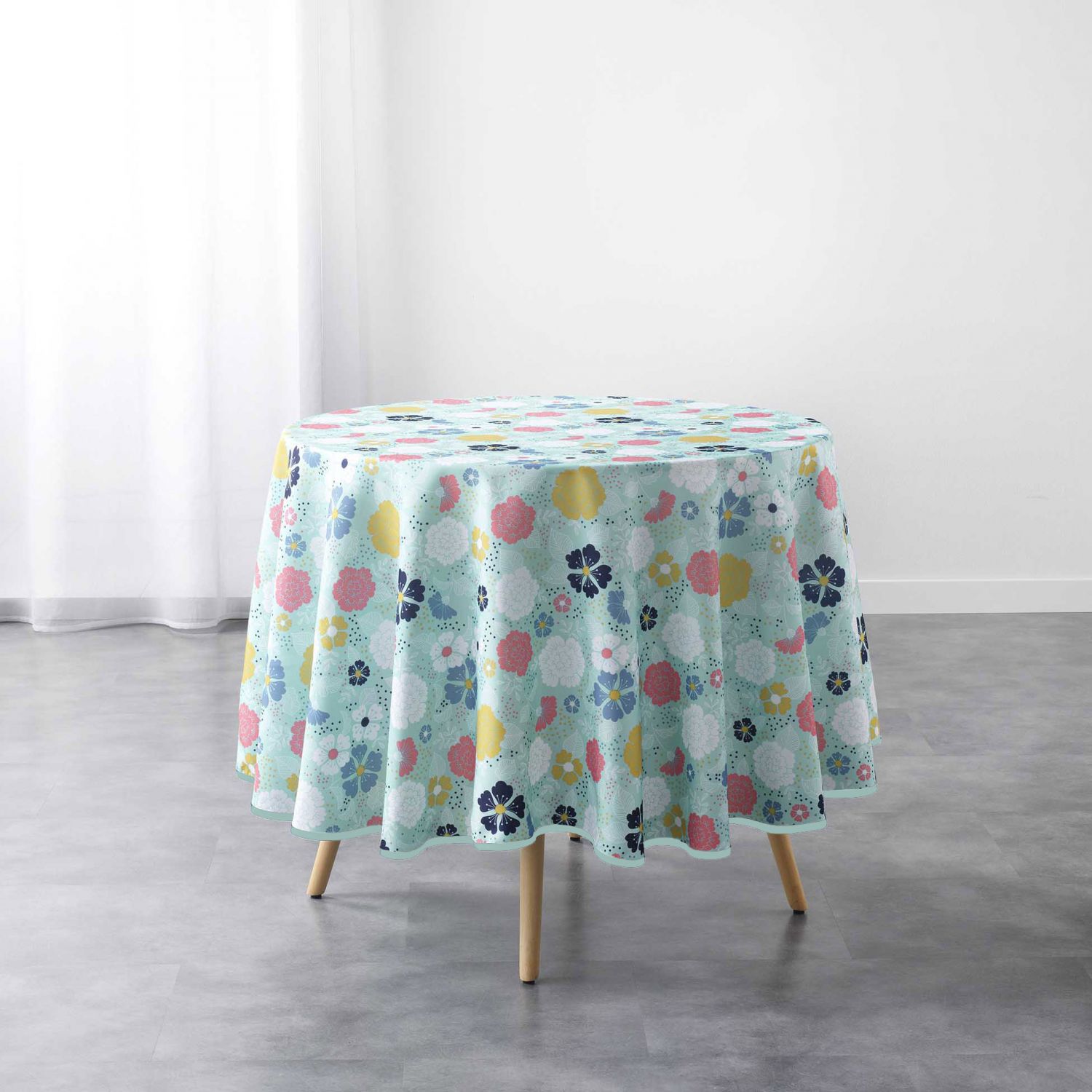 | Libellé | Nappe antitache ronde - Diamètre 180 cm - Fleurs colorées sur fond menthe |