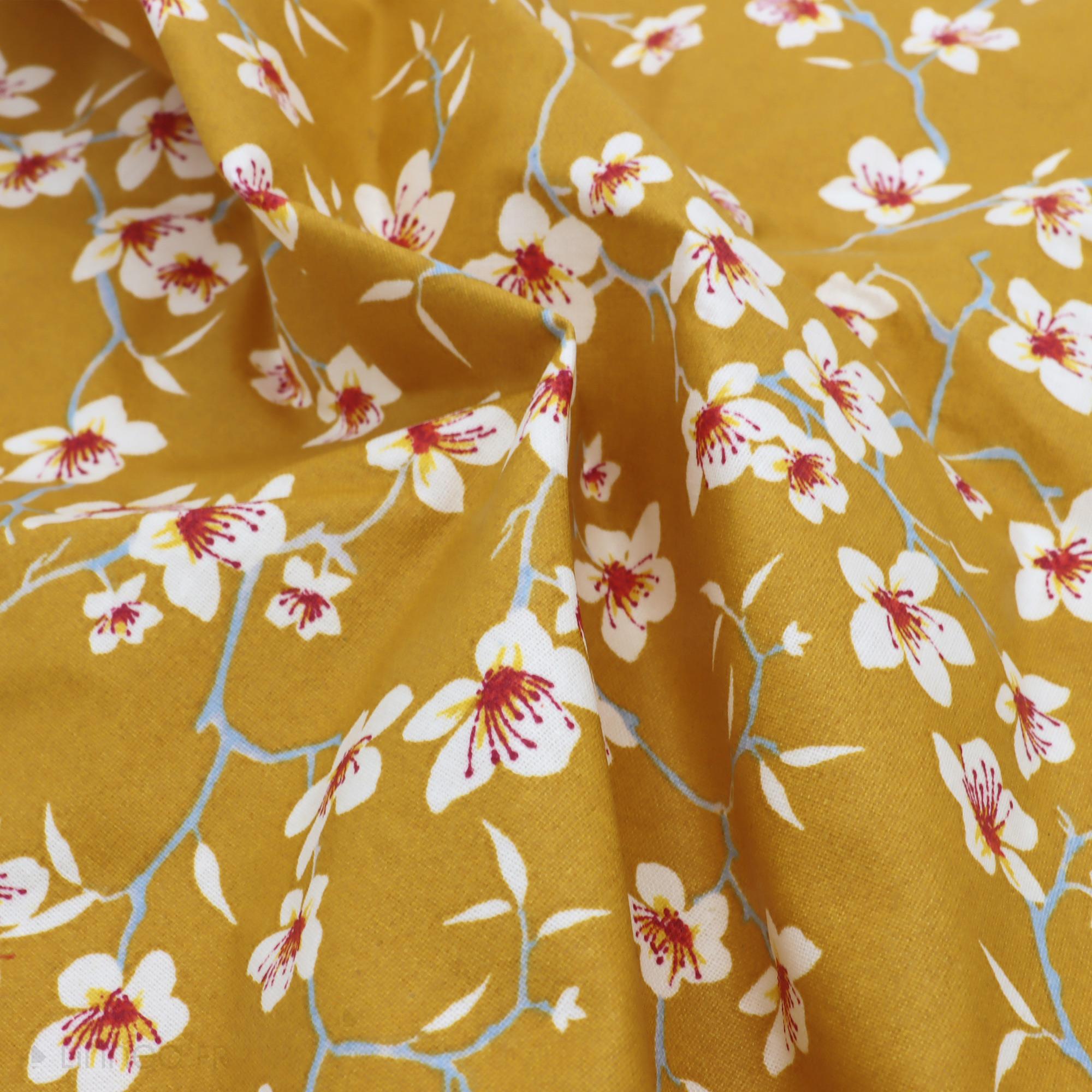 NAPPE CARRÉE AMANDIER chic et élégante en toile cretonne lourde enduite avec une parfaite finition qui vous garantie une excellente qualité et tenue dans le temps. Une nappe intemporelle qui habillera votre table avec un air d'été, avec un motif de petites fleurs d'amandier sur branches et feuillages discrets sur fond jaune Safran.
