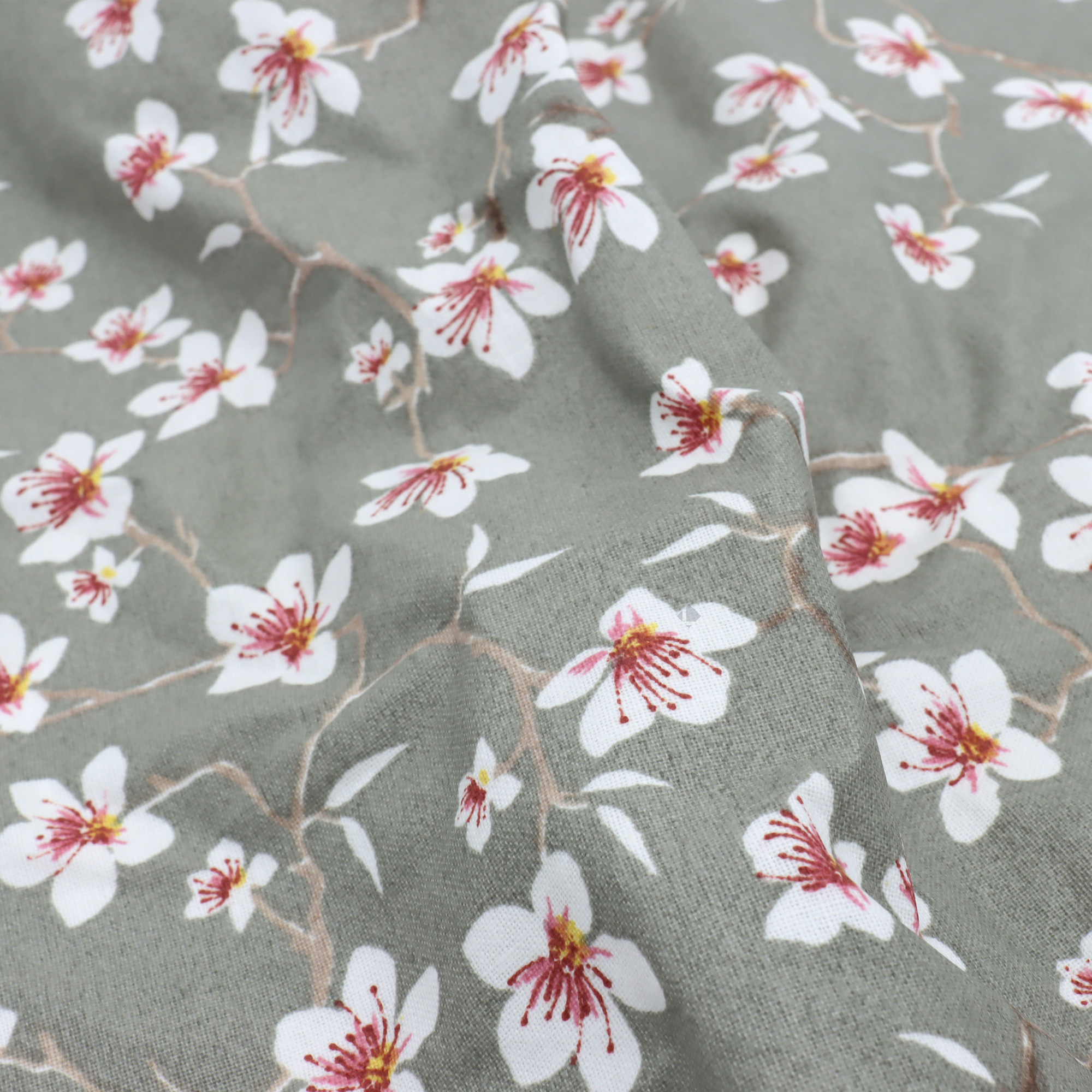 NAPPE CARRÉE AMANDIER chic et élégante en toile cretonne lourde enduite avec une parfaite finition qui vous garantie une excellente qualité et tenue dans le temps. Une nappe intemporelle qui habillera votre table avec un air d'été, avec un motif de petites fleurs d'amandier sur branches et feuillages discrets sur fond vert Sauge.