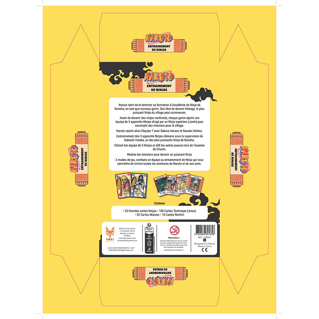 | La boîte contient | • 15 Grandes cartes Ninjas • 225 Cartes Technique (Jutsu) • 10 Cartes Mission • 10 Cartes Renfort |