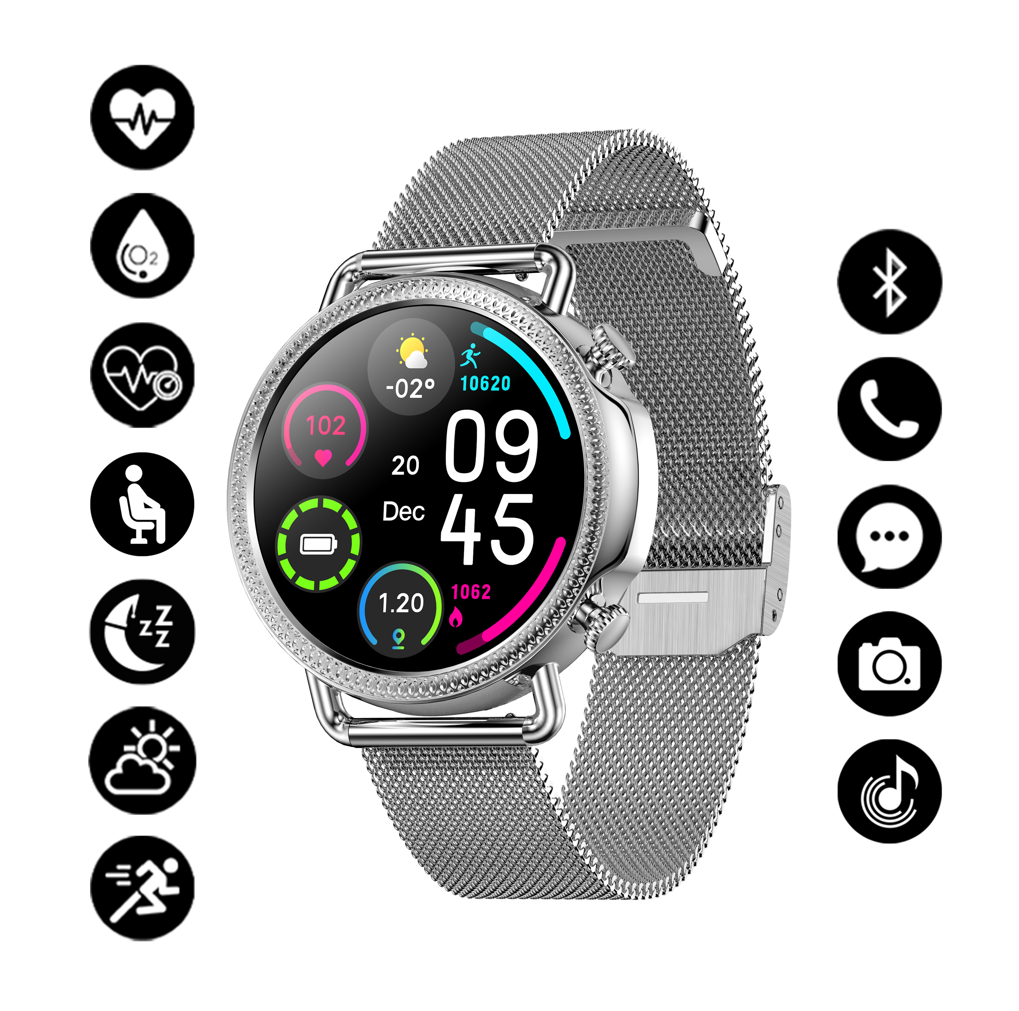 | Plus produit | Capteur santé (Fréquence cardiaque; Pression artérielle; Saturation en oxygène; Température corporelle; Moniteur de sommeil; G-sensor; Podomètre)Rappel du cycle physiologique; de la sédentarité; Geste de réveil; Centre de notification; Trouver le téléphoneMétéo; Chronomètre; Télécommande; Alarme; Vibration |